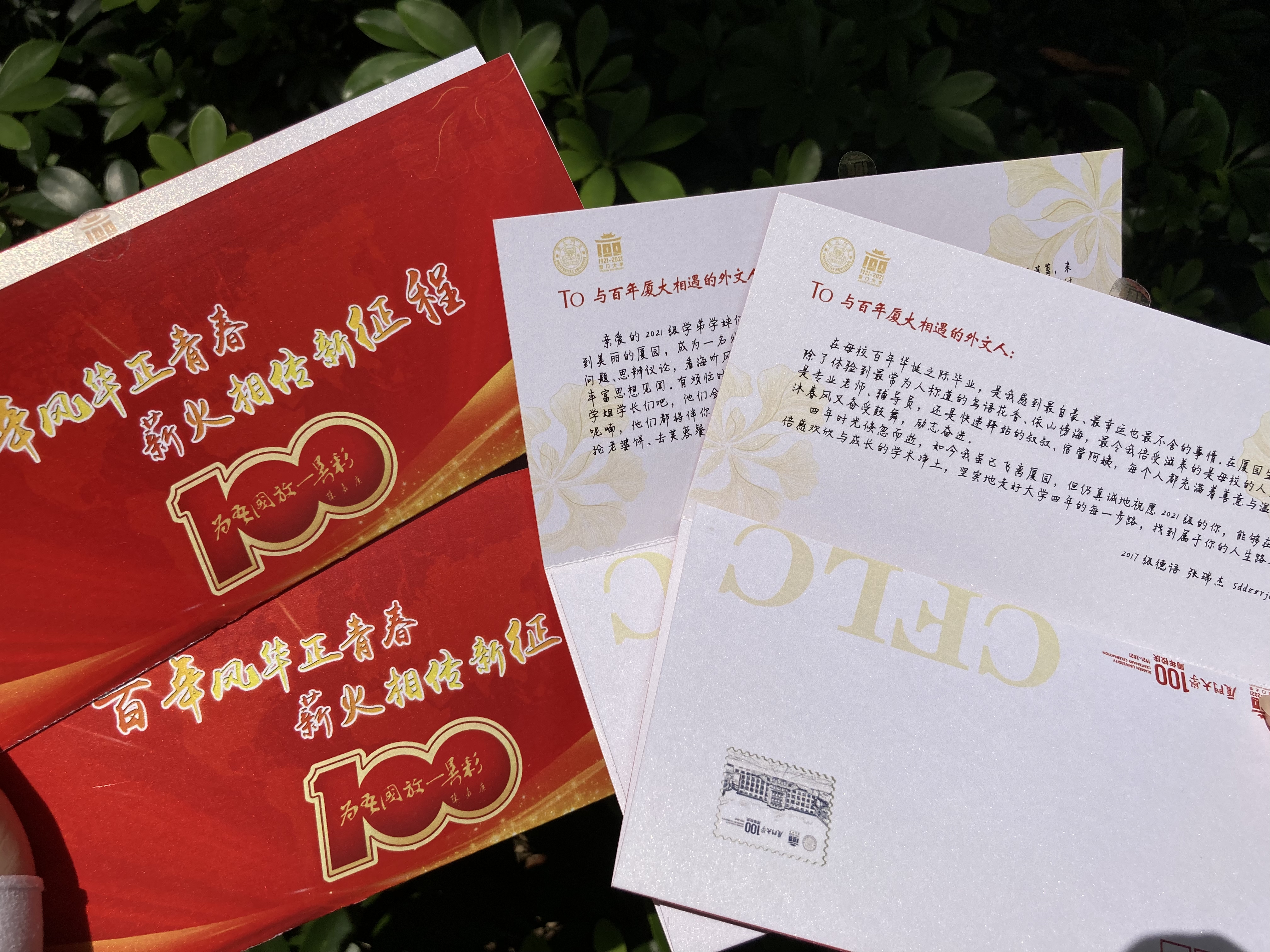 2021年恰逢中国共产党成立100周年、厦门大学建校100周年,习近平总书记首次提出了伟大建党精神并作出深刻阐释,号召全党继续弘扬光荣传统、赓续红色血脉,永远把伟大建党精神继承下去、发扬光大,在全党全社会激扬起继往开来、不懈奋斗的精神力量。厦门大学外文学院以“百年风华正青春,薪火相传新征程”为主题,精心组织2021届毕业生为新生手写寄语,分享成长感悟、表达美好祝愿,激励外文新学子牢记使命、勇敢逐梦,同时,还特别制作了印有习近平总书记对青年寄语的手举牌,每位新生报到后选择一个“寄语牌”,抽取一份“寄语信件”,在信纸上写下自己的青春梦想,并将承载着满满祝福和期待的信纸投入邮筒,“邮寄”给四年后的自己。这封寄语信既代表着新生们对自己未来大学生活的美好向往,更蕴含着学院对新时代外文人担负使命、奋斗青春的殷切期望。学院今年为新生准备的这份“入学礼”别出心裁,意义非凡,《厦门晚报》在报道中也提及了学院迎新工作的这一亮点。