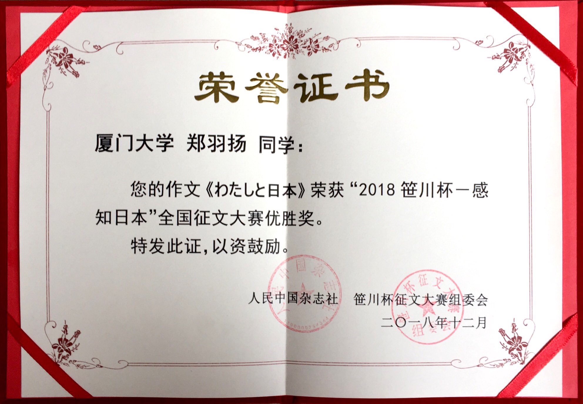 Champion of the National Sasakawa Cup Japanese Language Essay Contest in 2018