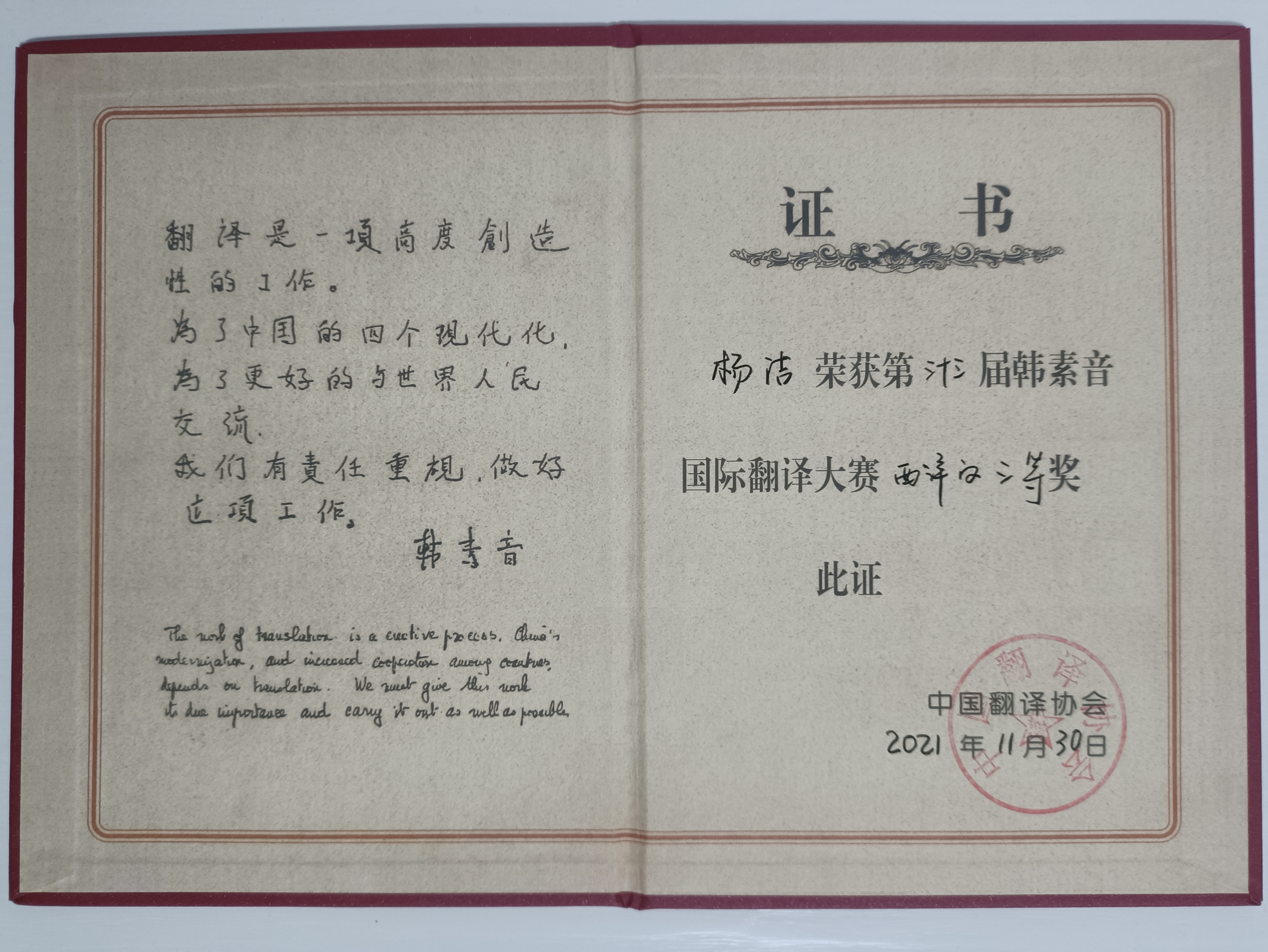 Third Prize in the 33rd Han Suyin International Translation Contest in 2021