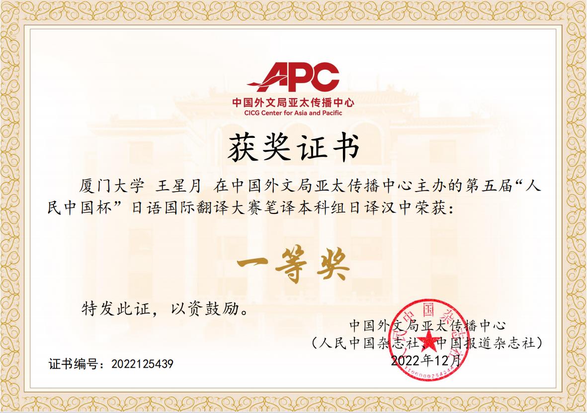 First Prize in the Japanese to Chinese Translation Category for Undergraduates at the 5th “People's China Cup” Japanese International Translation Competition in 2022