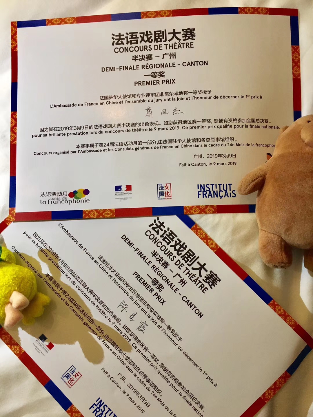 On March 9, the semi-final of the 2019 French Theater Competition (South China region), organized by the French Embassy in China and the Consulate General of France in Guangzhou, was held at the Guangzhou Watermelon Theater. Chen Xingxia and Xiao Fengjie, second-year students of CFLC’s French Department, won the first prize for their remarkable rendition of Le Bourgeois Gentilhomme, a classic work by Molière.