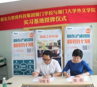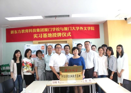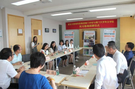 CFLC and New Oriental Education & Technology Group entered into a partnership agreement in Xiamen on May 23. Under the agreement, New Oriental would provide a practical training facility on its Xiamen campus for CFLC students. Attending the agreement signing ceremony were New Oriental Xiamen School principal Wu Xiaofei and human resources director Wu Dongdong and CFLC vice-dean Xu Qi, English Department chair Yang Shizhuo, and French Department chair Hu Jia. Earlier on May 9, New Oriental HR director Wu Dongdong and her associates visited CFLC and met with CFLC Professors Hu Jia and Yang Shizhuo. Both sides explored the possibility for New Oriental to provide a practical training facility for CFLC students. They eventually reached a consensus on the matter. Following the signing ceremony on May 23, CFLC officers toured New Oriental’s teaching facility in Xiamen. In his welcoming speech, Mr. Wu, principal of New Oriental’s Xiamen School, stated that his school each year recruits graduates from Xiamen University, and that they usually prove highly competent staff members. Mr. Wu also proclaimed that his school was delighted to provide a practical training facility and internship opportunities for CFLC students. He and CFLC vice-dean Xu discussed potential collaboration in scientific research and training of young teachers as well. Established in 1993 in Beijing, New Oriental Education & Technology Group is China’s leading provider of private educational services. It opened a school in Xiamen in 2008 and currently has 20 teaching centers in Xiamen and Quanzhou. New Oriental Xiamen School is the fourth institution to provide a practical training facility for CFLC students.