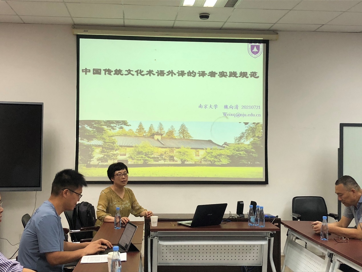 2021年7月21日晚,南京大学外国语学院英语系教授、博士生及博士后合作导师魏向清教授为外文学院师生举办了题为“中国传统文化术语外译的译者实践规范”的学术讲座,该讲座由外文学院英语系主任杨士焯教授主持。魏教授从术语学、翻译学以及跨文化知识传播的多重视角对文化术语翻译的译者实践规范进行较为全面系统的阐述,强调了文化术语翻译实践规范意识的重要性,并提供了相应的翻译规范策略指导。