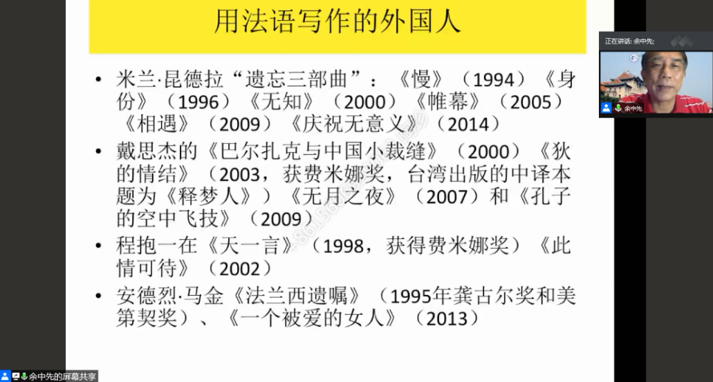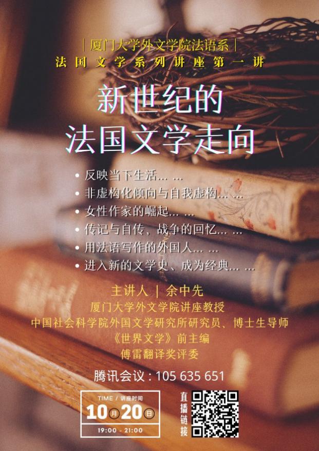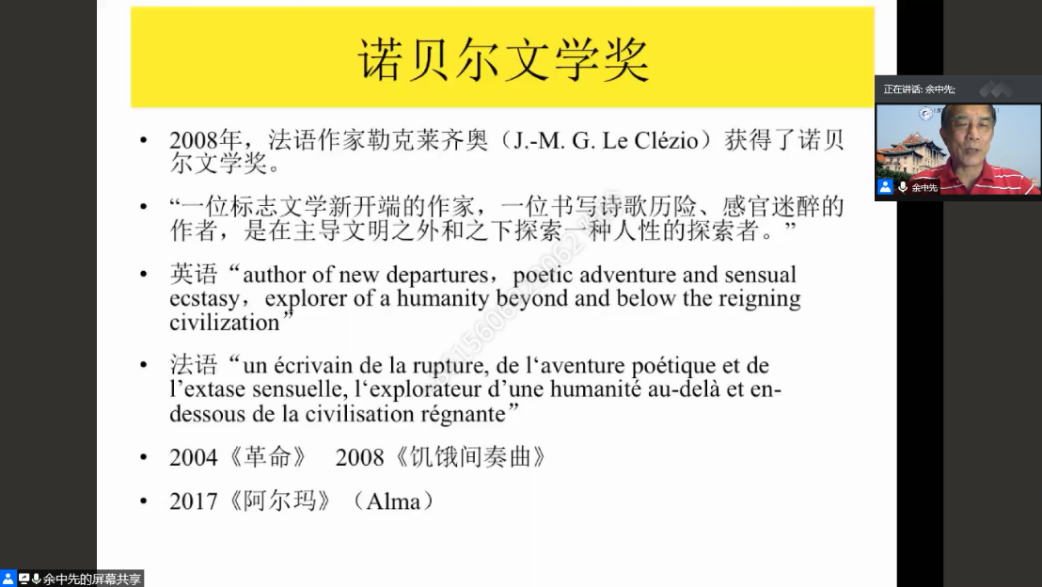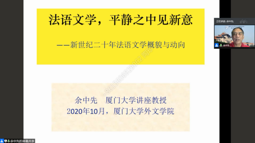 2020年10月20日晚,厦门大学外文学院讲座教授、中国社会科学院外国文学研究所研究员、博士生导师、《世界文学》杂志前主编、傅雷翻译奖评委余中先教授为我们带来了法国文学系列讲座的第一讲《新世纪的法国文学走向》,讲座由厦门大学外文学院法语系主任鲁京明教授主持,并邀请厦门大学外文学院讲座教授、南京大学外国语学院教授、博士生导师、中国法语教学研究会副会长、中国非洲问题研究会常务副会长刘成富教授做与谈人。讲座在腾讯会议举行进行。