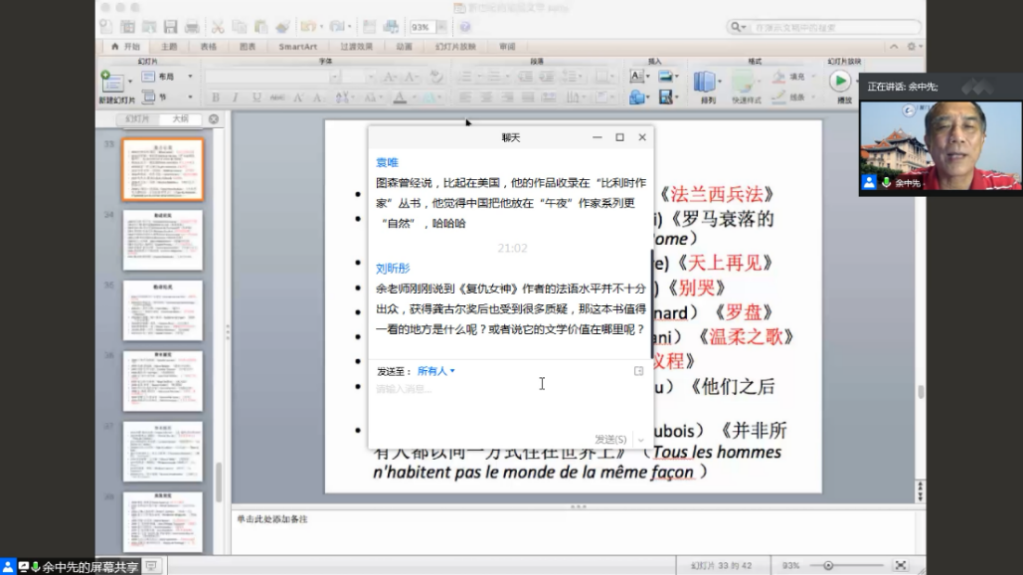 余中先教授的演讲结束后,讲座主持人鲁京明教授对本场讲座的内容做了精辟的总结,讲座与谈人、厦门大学外文学院讲座教授刘成富教授也进行了精彩的点评,并就在新世纪法语文学与战争的关系、文学中关于生与死的思考、法语文学的构建等方面发表了自己的见解,并同余中先教授做了进一步的交流和对话,令云端的广大听众深受启发。