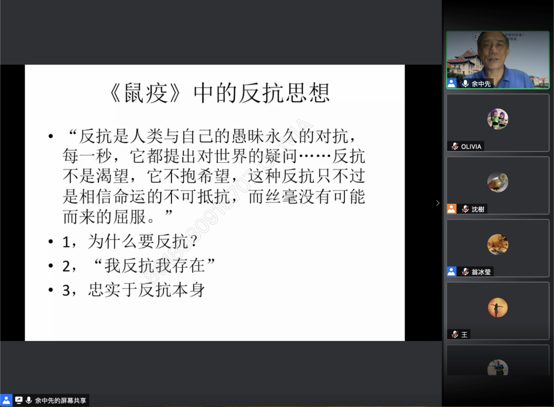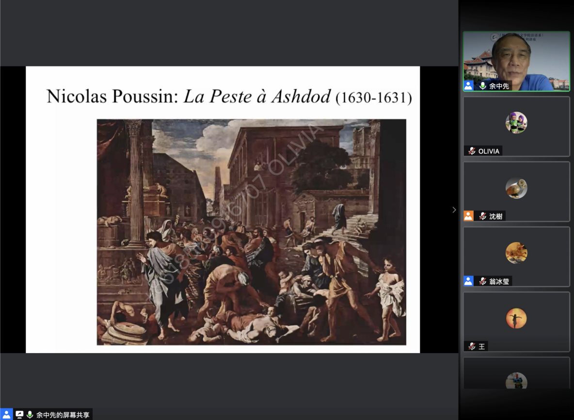 整场讲座,余中先教授以其渊博的学识、多重的研究角度以及生动的语言,为云端的广大师生学者带来了一场信息充沛,精彩绝伦,引人深思的学术讲座。余教授重谈法国文学中的瘟疫,不仅是给我们一个重温世界文学经典的机会,而且与当下时代语境相契合,也为我们提供了一个重新反思瘟疫的契机。