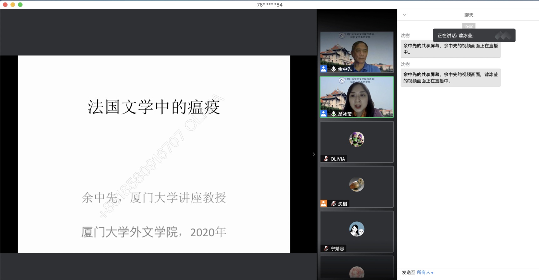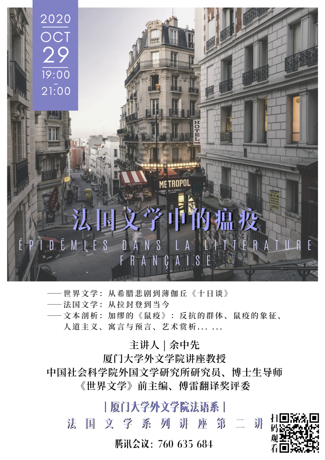 2020年10月29日晚,厦门大学外文学院讲座教授、中国社会科学院外国文学研究所研究员、博士生导师、《世界文学》杂志前主编、傅雷翻译奖评委余中先教授为我们带来了法国文学系列讲座的第二讲《法国文学中的瘟疫》。本次讲座由厦门大学外文学院法语系系副主任翁冰莹老师主持,在腾讯会议举行。