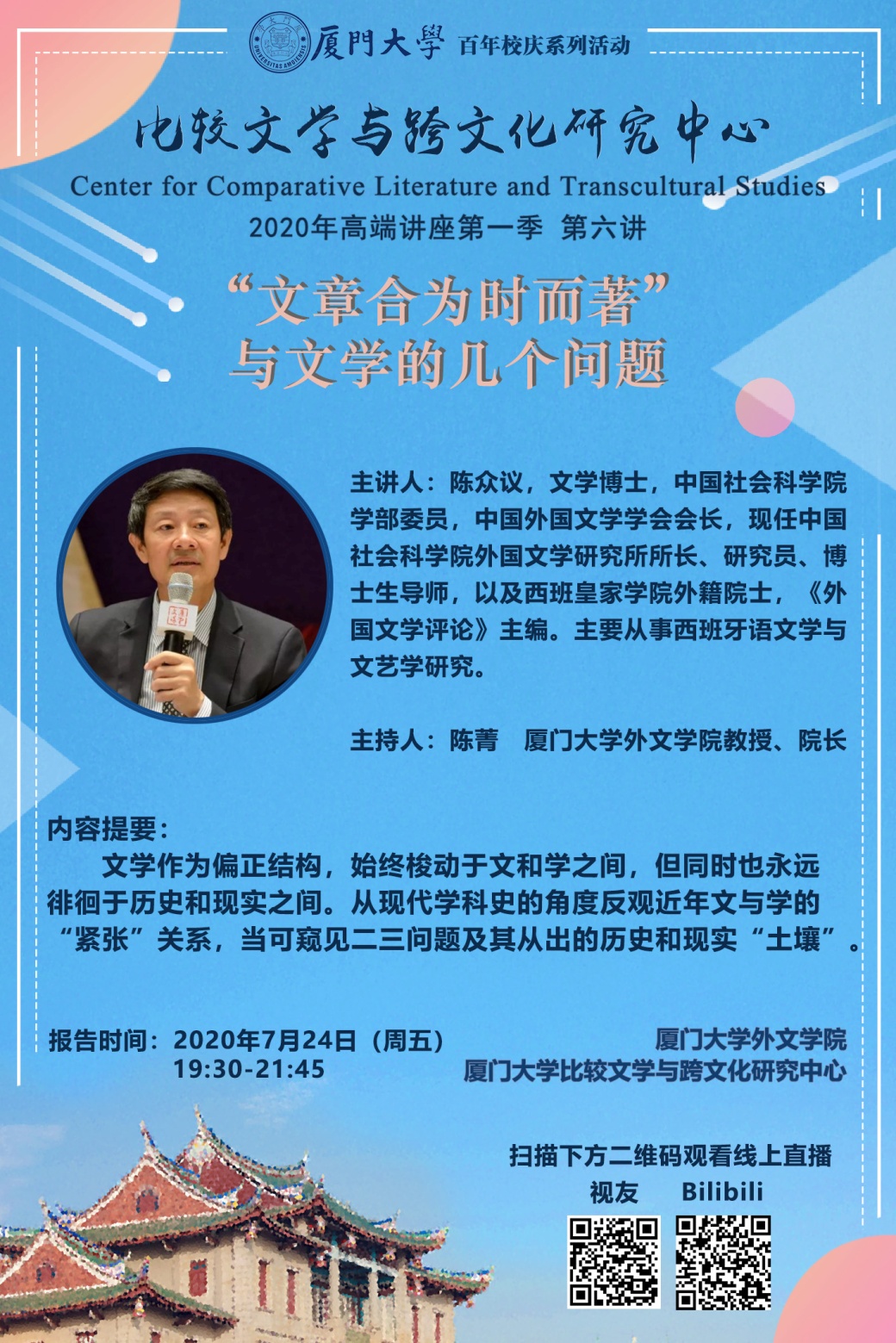 2020年7月24日晚19:30,厦门大学比较文学与跨文化研究中心的“美美与共:比较的意义”高端系列讲座第六讲,由陈众议所长开讲,带来题为“‘文章合为时而著’与文学的几个问题”的讲座。陈教授是全国政协委员、中国社会科学院外文所所长、研究员、博士生导师、西班牙皇家科学院通讯院士,兼任中国外国文学学会会长、《外国文学评论》主编等职。本次讲座由厦门大学外文学院院长陈菁教授主持,在腾讯会议进行,同时在B站、视友两大平台直播。