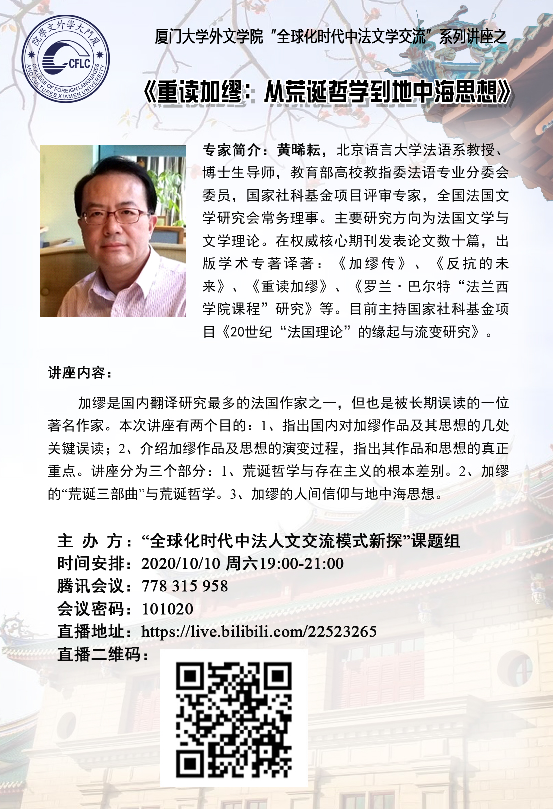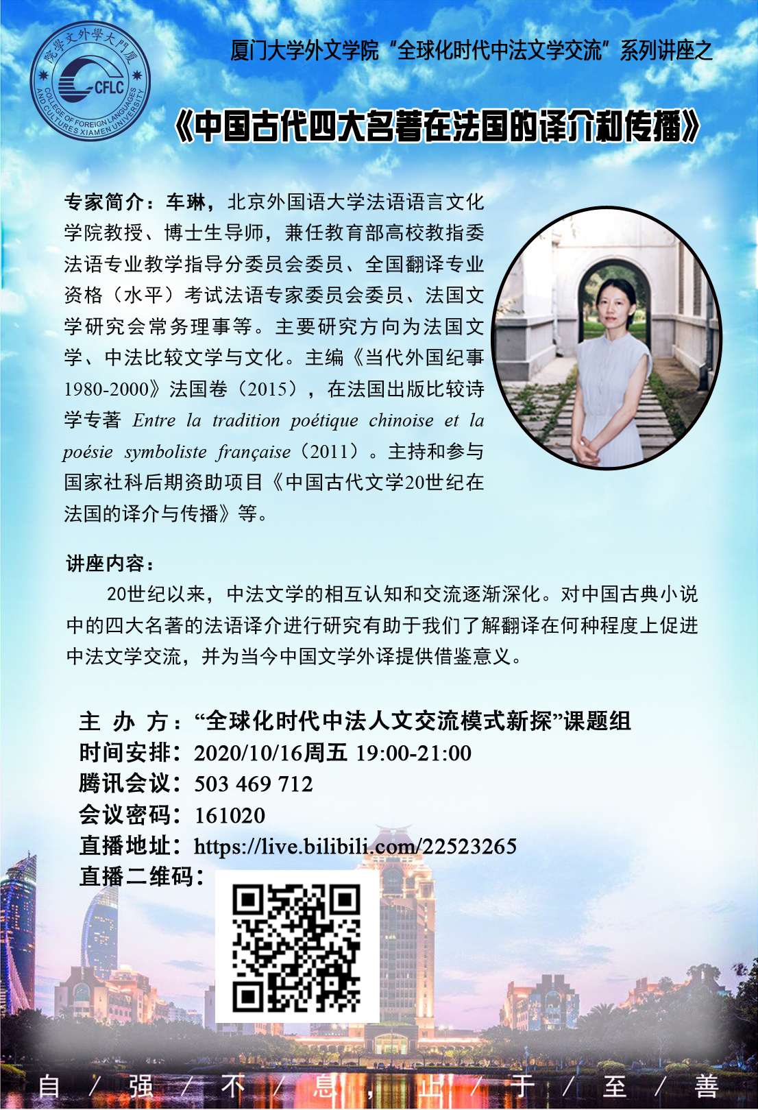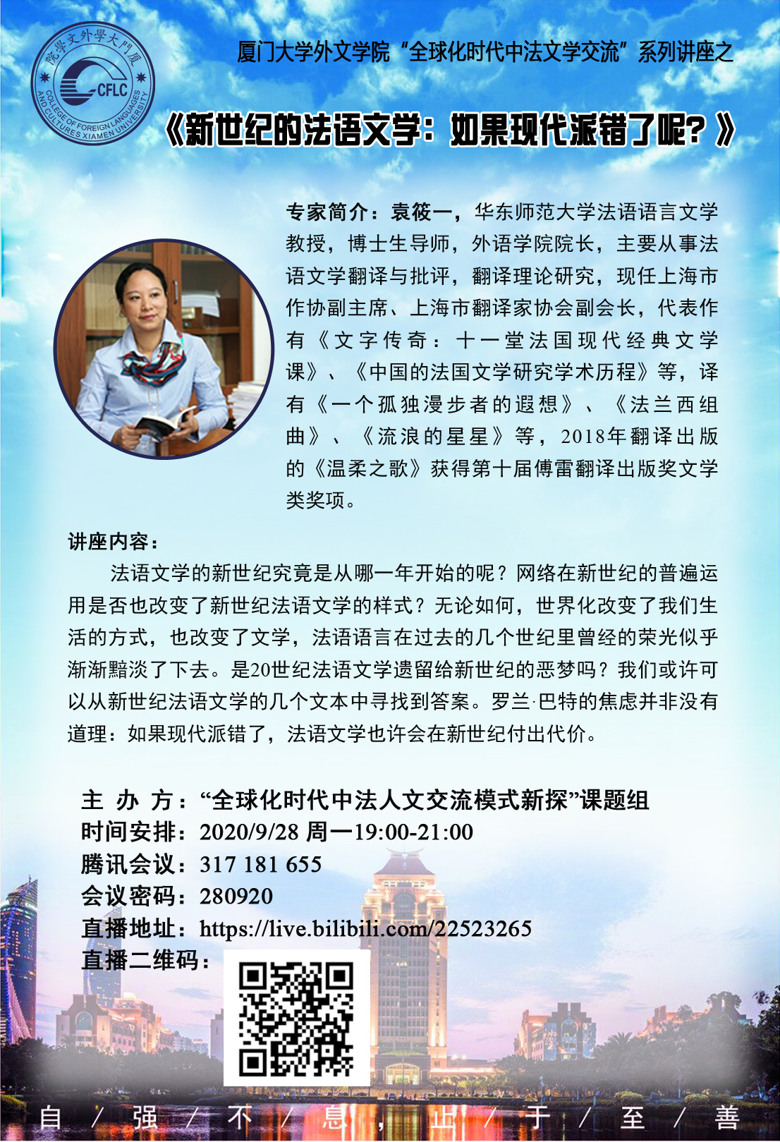 1、讲座题目:厦门大学外文学院“全球化时代中法文学交流”系列讲座之