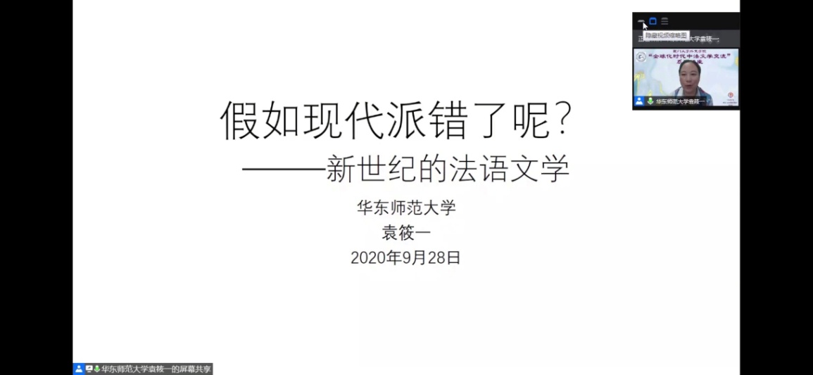 随着全球化浪潮的不断深入与横向拓展,中国逐渐走向世界舞台的中心。厦门大学外文学院 “全球化时代中法人文交流模式新探”课题组基于迄今为止中法之间人文交流的实践与认识,结合现今人文交流的亮点与趋势,推出“全球化时代中法文学交流”系列讲座,探究中法文学双向互动交流的具体实践与模式创新,以进一步加深中法文明的交融互鉴。2020年9月28日,华东师范大学外语学院院长、上海市作协副主席、翻译协会副会长袁筱一教授带来了“全球化时代中法文学交流”系列讲座的第一讲——《新世纪的法语文学:如果现代派错了呢?》,讲座由厦门大学外文学院法语系系主任鲁京明教授主持。此次讲座在腾讯会议展开,通过B站进行全球直播。袁筱一教授的讲解从容不迫、娓娓道来,又高潮迭起、妙语惊人,袁教授以其渊博的学识为我们带来了一场视野宏大、信息充沛的演讲,为我们展开了一幅新世纪法语文学的全景图。