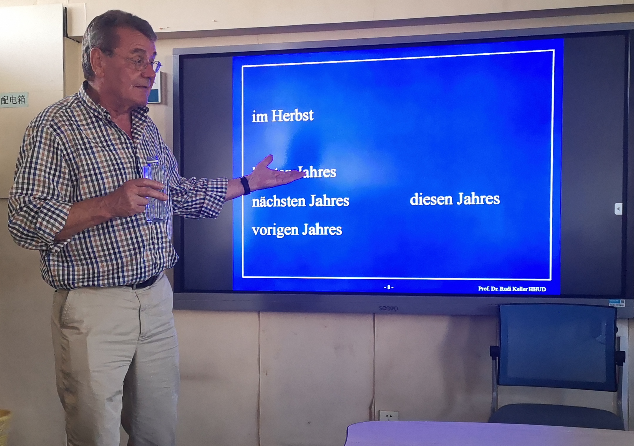 2019年10月21日,德国杜塞尔多夫大学教授、语言学家鲁尔道夫·凯勒(Rudi·Keller)先生来到我院,于上午10点和下午14点30分,为我院德语专业全体同学带来了题为“关于语言的变迁”和“德语有衰败的危险吗”两场德语语言学专题的学术讲座。