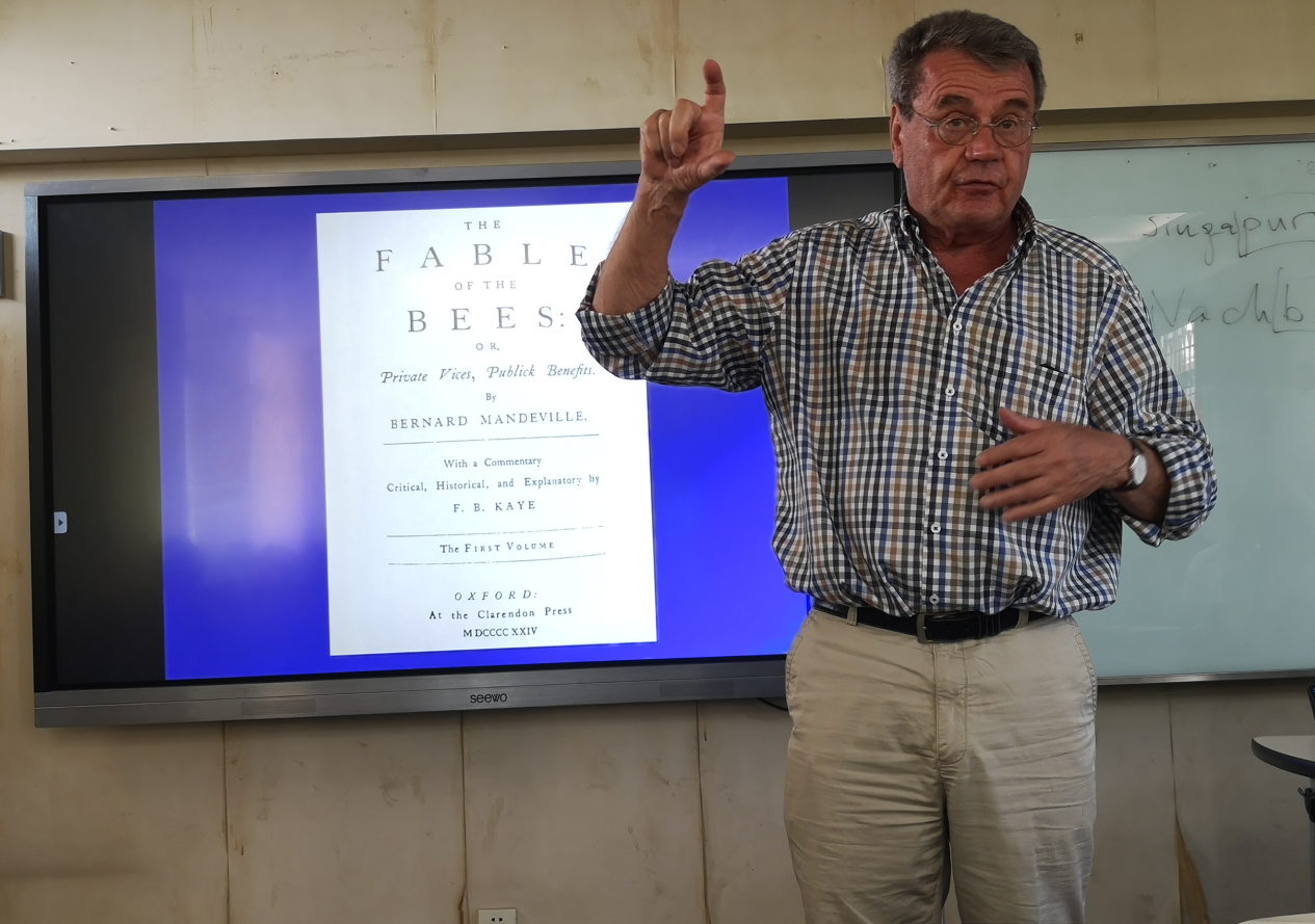 上午的讲座题为“关于语言的变迁”,凯勒教授由一个概括性的问题“语言为何要变”出发,沿着语言学史的脉络,将近代以来人们探索语言变迁的过程徐徐展开,首先介绍了“印欧语系”概念的开创者,指出了人们最初对于语言变迁的设想:或许有一种共同的原初语言,演化成今天的不同语言。随后,他提到荷兰作家曼德维尔的《蜜蜂寓言》,借用这个寓言的寓意“私人的恶德反而可以造就社会公益”,来说明,是人们对语言的自发改变造就了今天的语言。