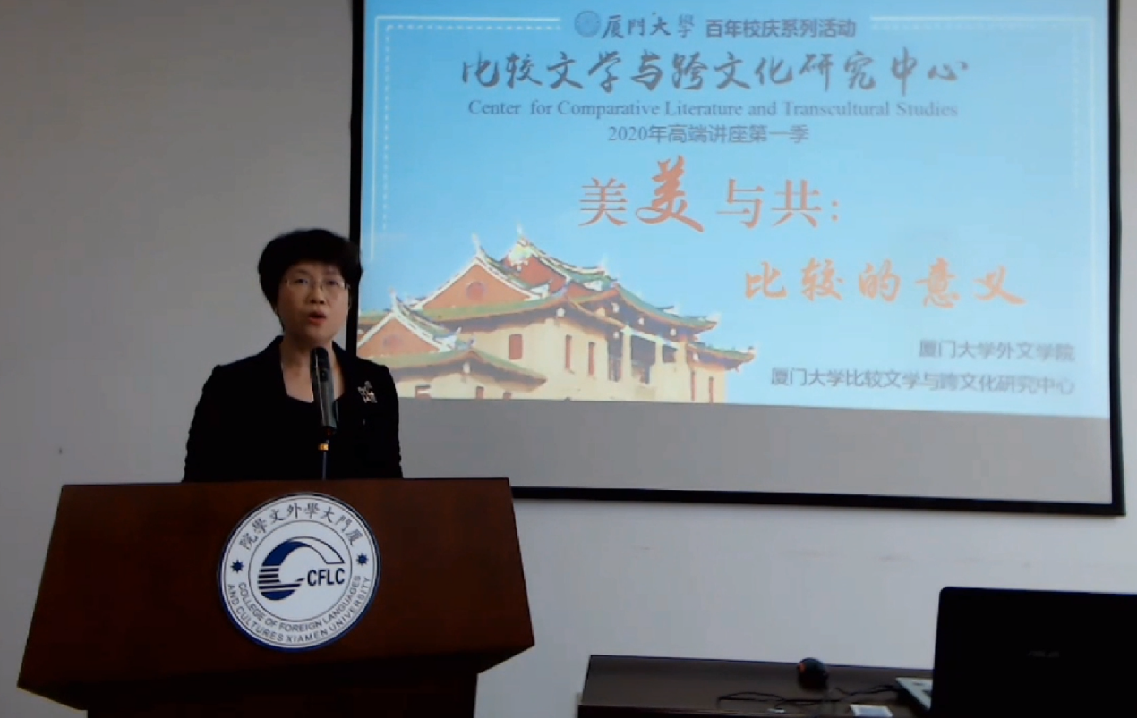 厦门大学外文学院院长陈菁教授主持开讲仪式并致辞。陈院长的致辞以21世纪提倡开放多元、求同存异的时代精神为背景,鼓励中心的中青年学者主动思考外语学科的发展如何助力人类命运共同体中不同文明之间的沟通与互鉴,同时也希望外文学院和比较文学与跨文化研究中心搭建的平台能够为海内外学者提供一个思想碰撞、美美与共的机会。陈院长对支持与帮助厦门大学比较文学与跨文化研究中心的诸位学者表示衷心的感谢,并预祝讲座圆满成功。