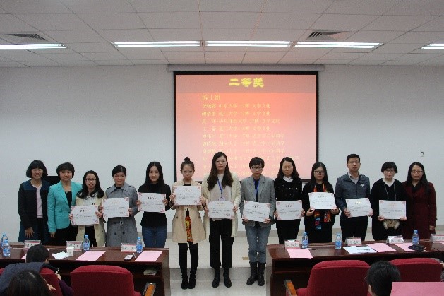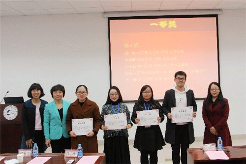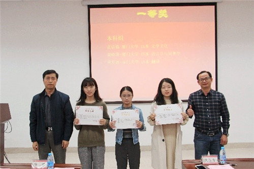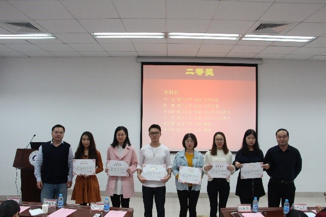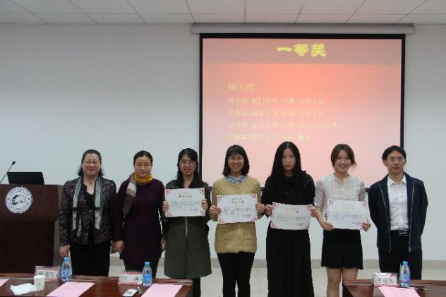 厦门大学外文学院英语语言文学专业2015级博士生汪永勤等六位一等奖论文作者代表首先进行了精彩的答辩展示。接着,厦门大学外文学院党委副书记沈丽秀宣布获奖名单,并由出席的嘉宾、领导和老师为获奖者颁奖。