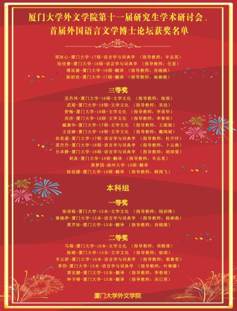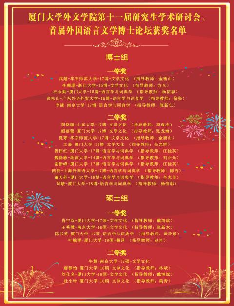 附:厦门大学外文学院第十一届研究生学术研讨会、首届外国语言文学博士论坛获奖名单