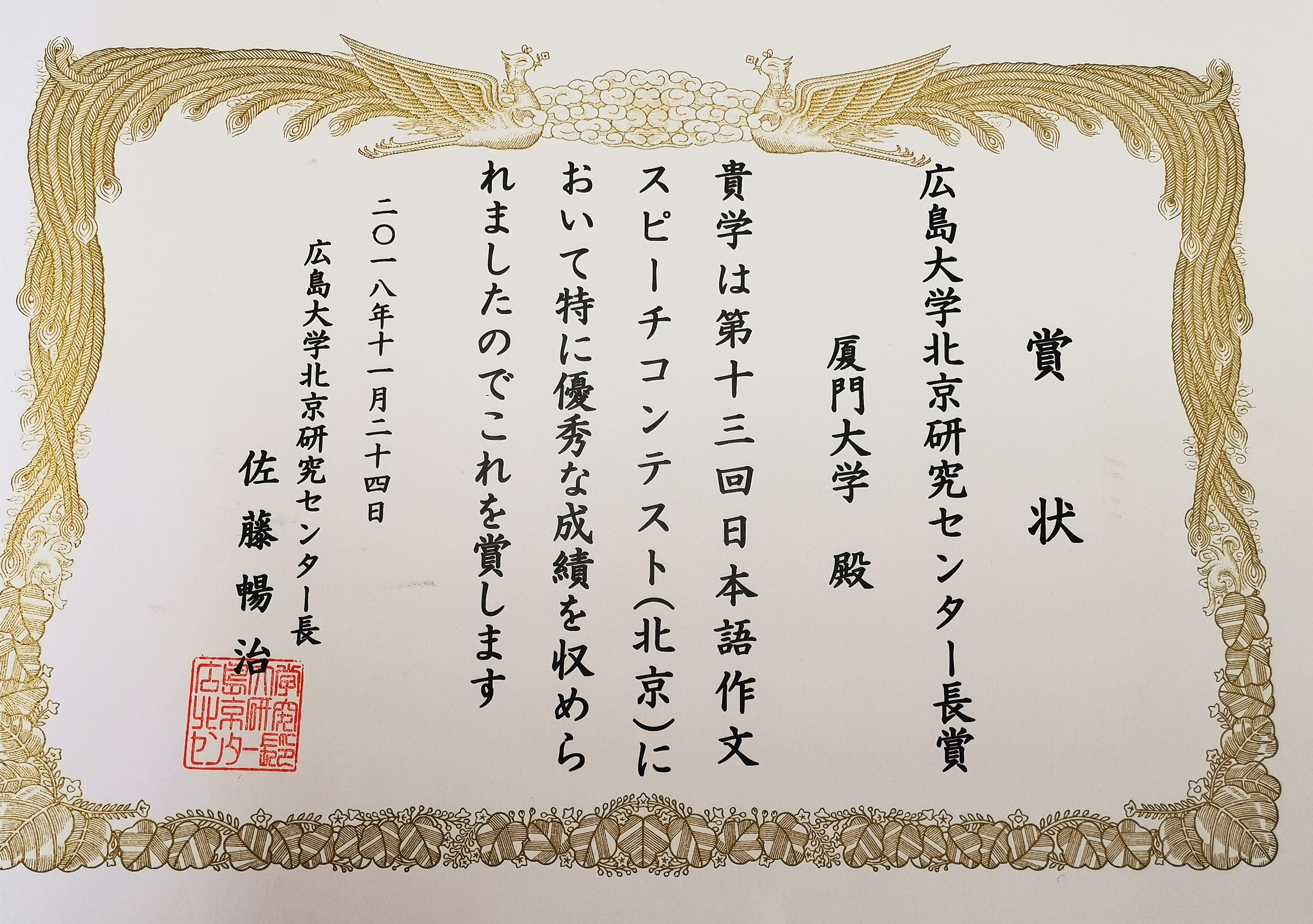 11月24日,以中国大学生为参赛对象的“第13届广岛大学日语作文演讲比赛”在首都师范大学举行。通过第二轮复赛的4名参赛选手进入个人总决赛,发表了热情洋溢的演讲,得到了到场中日观众的高度评价。我院日语系2016级本科生阮琳榕同学凭借沉着的演讲风格、优美的日语发音斩获全国总决赛特等奖。这也是,阮琳榕同学在今年7月份荣获“第13届中华全国日语演讲比赛”总决赛季军之后的又一个全国大奖。另外,由日语系2015级本科生何行实、2016级本科生阮琳榕、江林岳、吴星如、杨毓等5名同学组成的厦门大学团队荣获该比赛唯一的团体金奖。此次荣膺双冠,彰显着我院学子的良好风貌和扎实的日语语言功底,更为我院增添一份荣耀。该比赛项目获厦门大学2018年本科生学业竞赛项目立项。