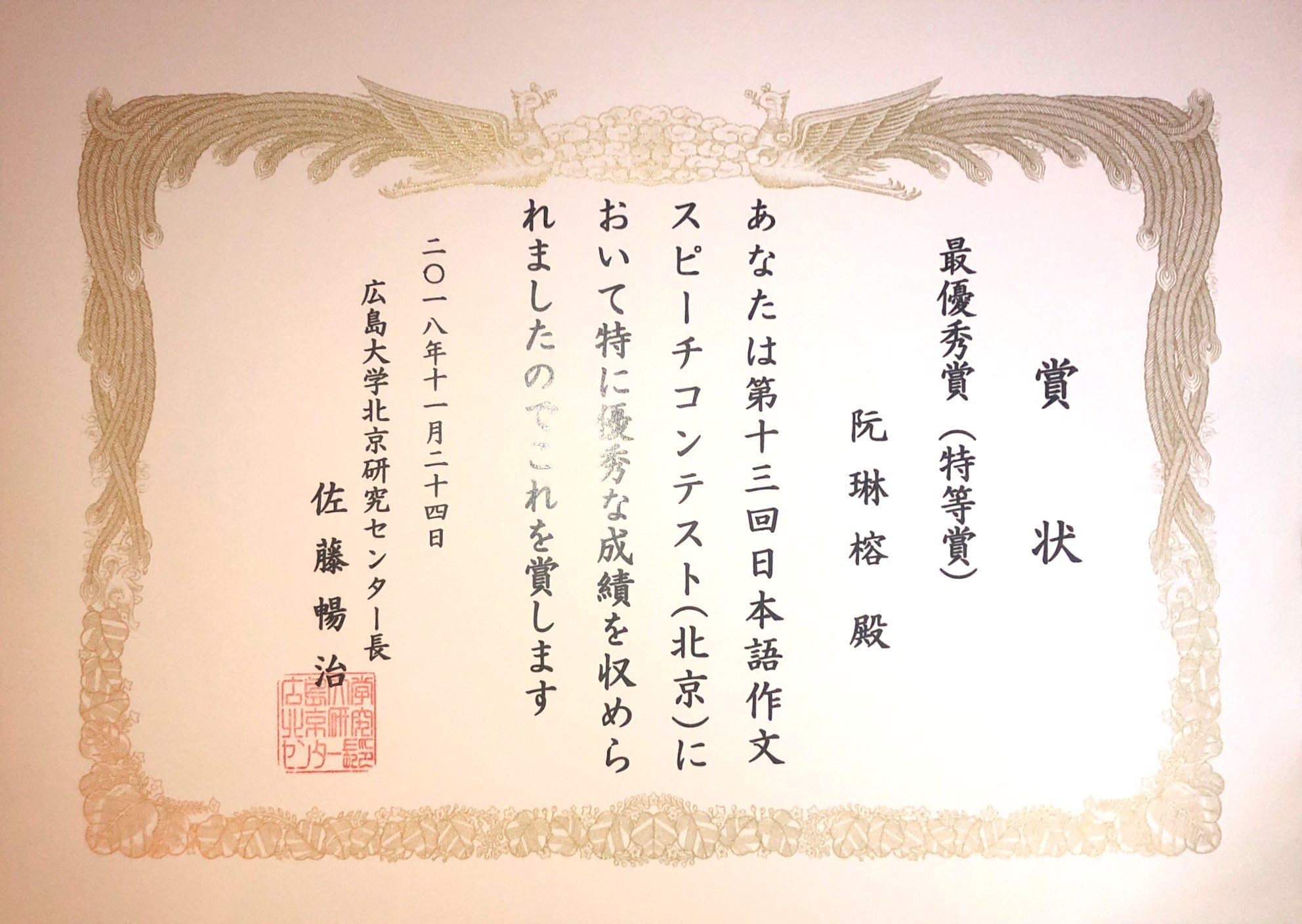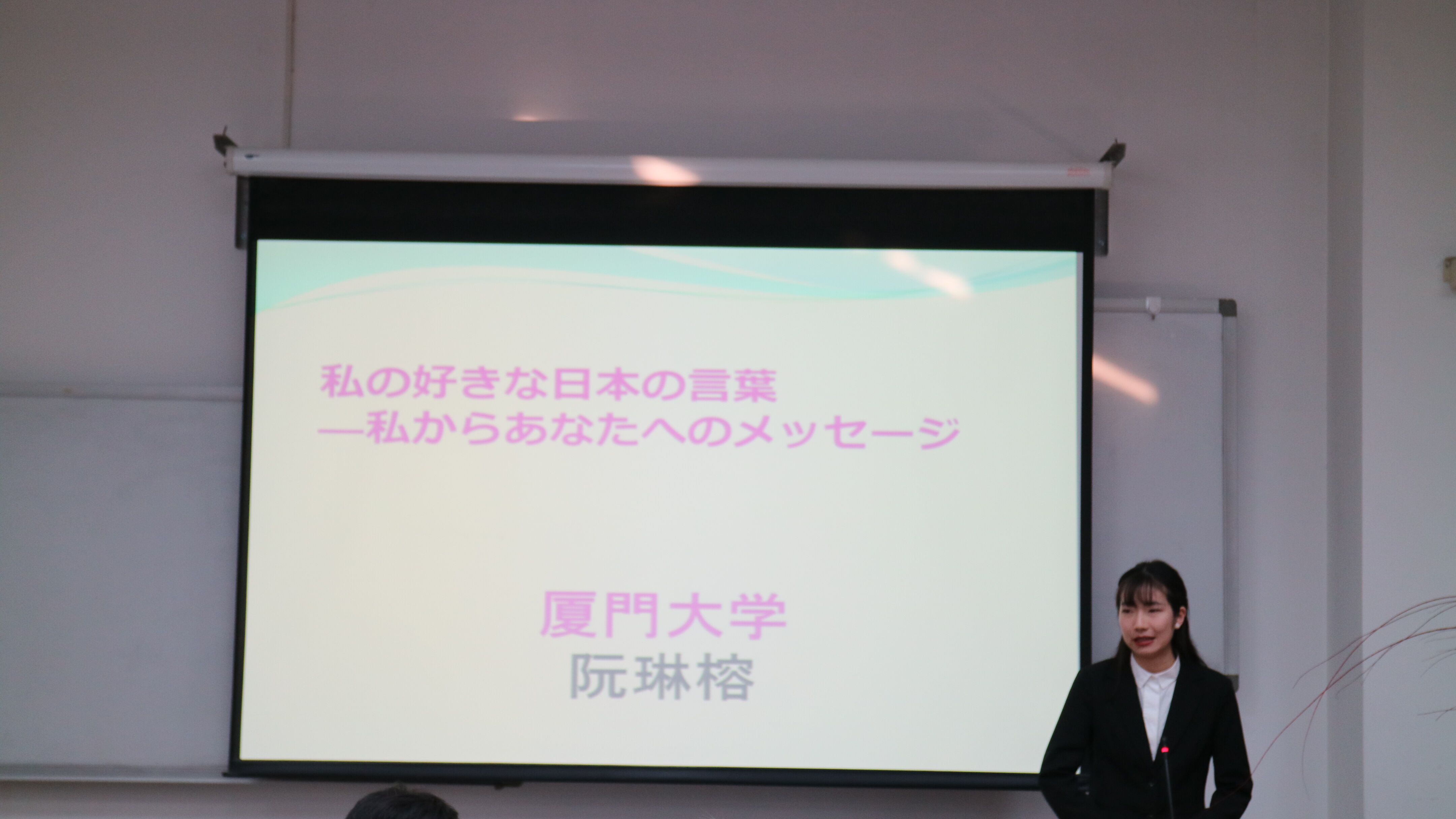 比赛当日,选手们以“我喜欢的日语——向你传达的信息”为题目进行了命题演讲。阮同学以“请安全(ご安全に)”为题,结合自己在日本钢铁工厂的参观学习经历,阐述了包涵在日语寒暄语中的心意的重要性,获得了在场评委老师与观众的一致好评。最终,我院阮琳榕同学与中山大学王羽晴同学并列获得特等奖。