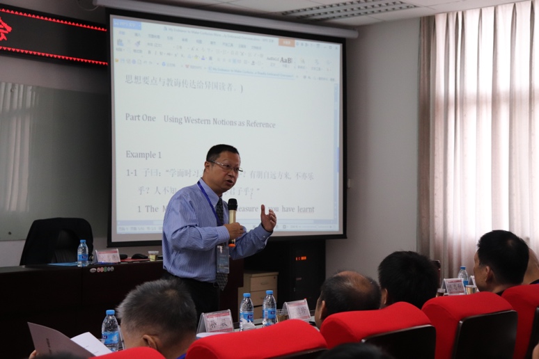 上午的会议中,各位教授分别作了主旨演讲。上海外国语大学史志康教授作了题为“When Confucius Meets Shakespeare and Other Great Minds in the West——My Endeavor to Make Confucius’ Analects More Readily Embraced Overseas”的演讲;福建师范大学外国语学院林大津教授作了题为“中国经典外译人才培养任重道远”的演讲;“四书”英译者吴国珍先生作了题为“‘四书’英译语内翻译的若干疑思”的演讲;厦门大学外文学院杨士焯教授作了题为“试论《孙子兵法》几个主要译本的译文表述方式”的演讲。各位学者皆具有了极为丰富的翻译经验,亦出版了不少翻译著作,尤其是涉及到《论语》、《孙子兵法》等一批中国经典的翻译,就此提示了自身的独特理解与翻译技巧,博得了在场学者与学生的掌声与共鸣。