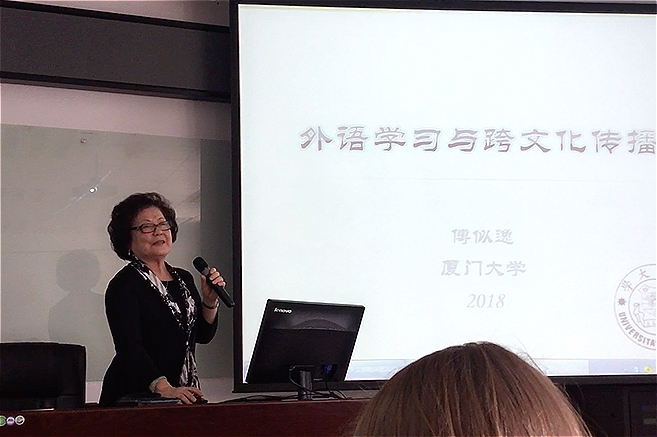 首先,傅教授向在座的同学们讲述了自己对外语和孔子学院的见解。她说,外语不仅是学科知识,更是一种国家战略资源和对外文化交流的纽带。孔子学院的建设在为增进世界人民对中国语言和文化的了解、促进世界多元化文化的发展方面发挥了重要作用。傅教授指出,近年来,厦门大学外文学院对孔子学院的建设及人才培养做出了很大贡献:迄今,在我校已与五大洲13个国家的16所高校合作建设的16所孔子学院之中,有9所孔子学院的中方院长都来自厦门大学外文学院。