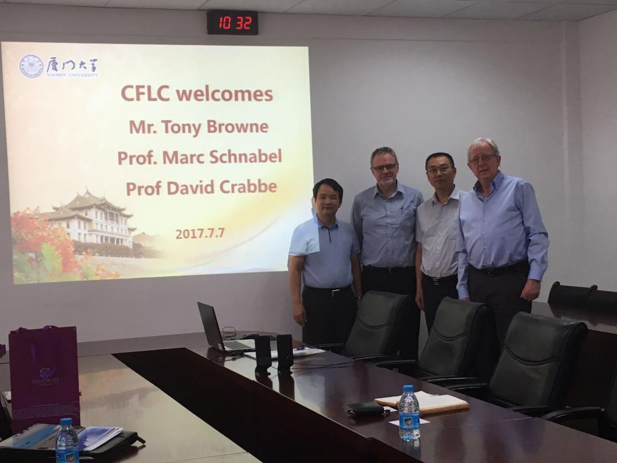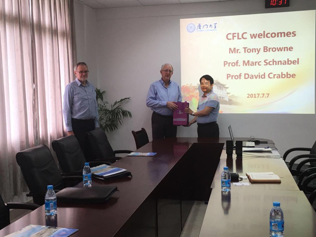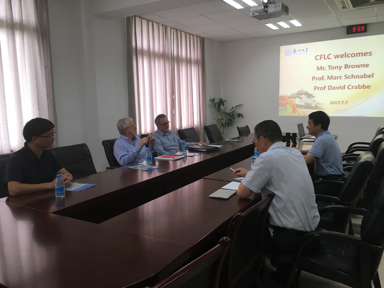 2017年7月7日,新西兰惠林顿维多利亚大学Tony Browne先生和David Crabbe教授莅临厦门大学外文学院。英语系杨士焯主任和张龙海院长与其会面,并在南光三524会议室进行了简短的会议。