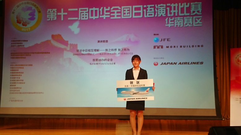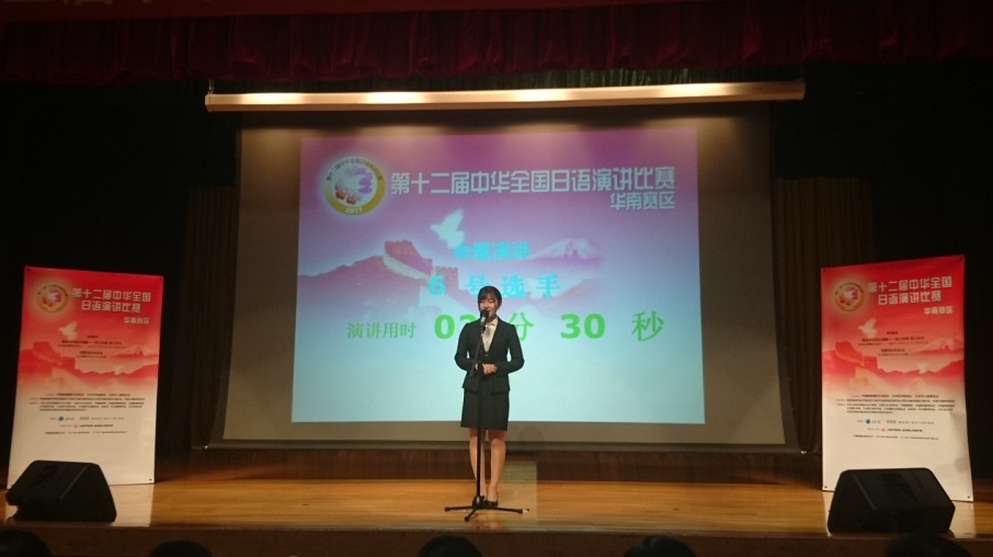 中华全国日语演讲比赛是由中国教育国际交流协会、日本经济新闻社、日本华人教授会联合主办的一场全国性日语演讲比赛,旨在增进中日两国人民之间的友谊、加深相互理解,提高我国大学生学习日语的热情,促进日语水平的提高。本次华南赛区比赛共有29所高校的选手同场角逐。上午场以“增进中日相互理解:我之所想,我之所为”或“我要创办的企业”为题目,各位选手进行了约5分钟的命题演讲。郝菲同学以“我要创办的企业”为题,以“倾听”为切入点,通过为当今社会背负压力的人们派遣倾听者和交谈对象,表达了实现和谐社会的美好愿望。