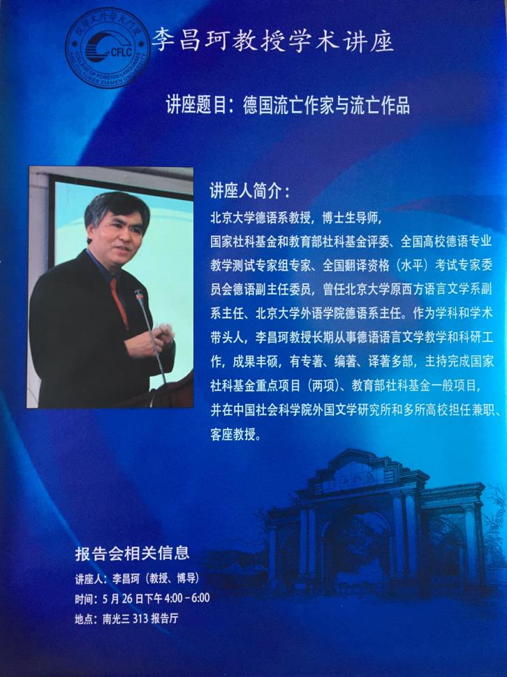2017年5月26日下午4时,北京大学德语系教授、博士生导师李昌珂教授应邀在南光三313报告厅为外文学院欧语系德语专业的师生作了一场以“德国流亡作家和流亡作品”为题的讲座。欧语系副主任方厚升教授主持本次讲座,我院德语专业全体教师、法语系部分老师到场共享文学魅力。