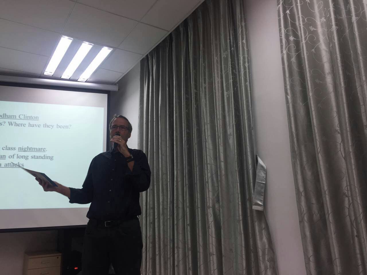 在讲座上,Bratt教授给同学们详细介绍了美国总统的选举制度和选举程序,分析了当前美国政治和社会文化发展现状,从两位候选人的各自优劣势出发深入剖析了今年选举竞争异常激烈的原因。