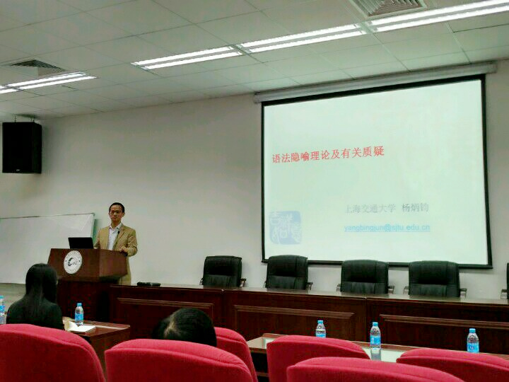 在讲座中,杨教授主要介绍了功能语言学中语法隐喻的理论及相关质疑。根据他的研究与分析,语法隐喻理论在以下七个方面存在问题:一、语法隐喻理论过分强调隐喻式与一致式的意义同一性;二、一致式的定义不清楚;三、语法隐喻已经被语法化理论所包括,语法隐喻形成的句法结构变化属于共时语法化的研究范围;四、非隐喻式并不就是一致式,一致式和隐喻式之间有很大的灰色地带;五、语篇隐喻是否存在;六、语法隐喻即“相同的所指,不同的能指”并不准确;七、如果将词汇的选择和语法形式的变异都看作是隐喻,语法隐喻就有可能成为“垃圾篓”。