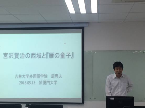 2016年5月12日上午10时,外文学院日语系邀请了学科评估专家、吉林大学外国语学院院长周异夫教授莅临本校,在外文学院南光三219教室就“宫泽贤治的西域与《雁童子》”这一主题举行了学术讲座,厦门大学外文学院日语系主任吴光辉教授主持了讲座。本次讲座吸引了来自全校不同专业的同学们踊跃参与,周教授与参与者进行了深入的交流,反响热烈。