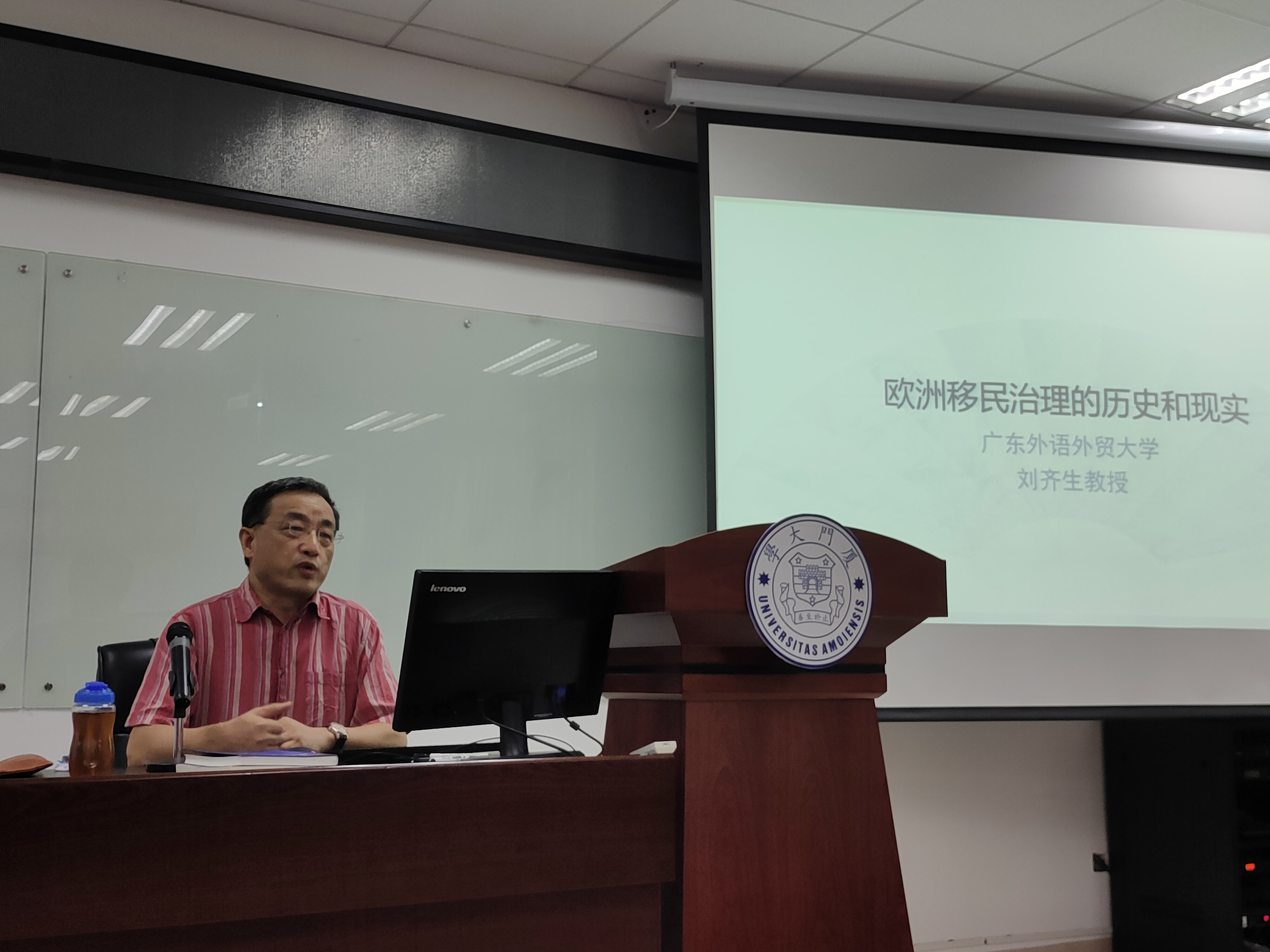 2021年7月6日晚,广东外语外贸大学教授、博士生导师刘齐生老师在厦门大学南光三313教室为外文学院师生举办了题为 “欧洲移民治理的历史和现实”的精彩讲座。外文学院欧语系刘悦教授主持了讲座。外文学院师生积极参加了此次讲座。讲座现场座无虚席,主要参加对象为外语创新实验班全体同学,以及来自本院德语以及其他专业的师生。