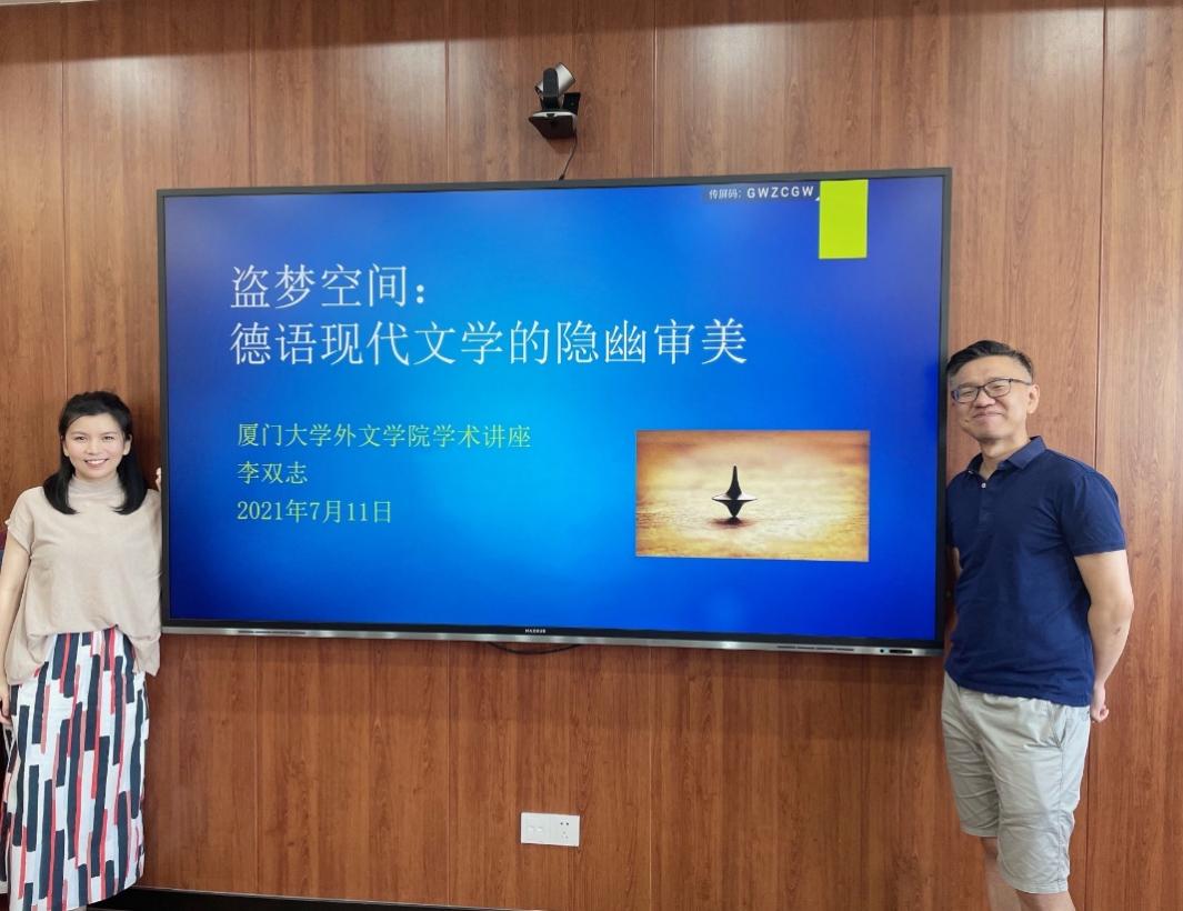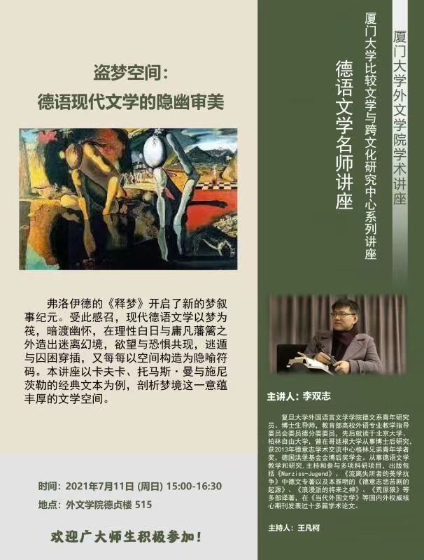 导语:7月10日下午,复旦大学外国语言文学学院德文系青年研究员、博士生导师,教育部高校外语专业教学指导委员会德分委委员李双志老师为广大师生带来了厦门大学比较文学与跨文化研究中心德语文学名师讲座——盗梦空间:德语现代文学的隐幽审美。讲座由厦门大学外文学院欧语系德语专业王凡柯老师主持。在这一讲中,李双志教授以梦为筏,选取卡夫卡、托马斯·曼、施尼茨勒的经典文本为例,剖析梦境这一意蕴丰厚的文学空间。