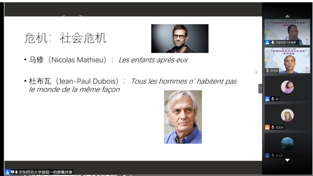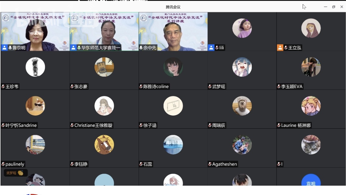 随着全球化浪潮的不断深入与横向拓展,中国逐渐走向世界舞台的中心。厦门大学外文学院 “全球化时代中法人文交流模式新探”课题组基于迄今为止中法之间人文交流的实践与认识,结合现今人文交流的亮点与趋势,推出“全球化时代中法文学交流”系列讲座,探究中法文学双向互动交流的具体实践与模式创新,以进一步加深中法文明的交融互鉴。2020年9月28日,华东师范大学外语学院院长、上海市作协副主席、翻译协会副会长袁筱一教授带来了“全球化时代中法文学交流”系列讲座的第一讲——《新世纪的法语文学:如果现代派错了呢?》,讲座由厦门大学外文学院法语系系主任鲁京明教授主持。此次讲座在腾讯会议展开,通过B站进行全球直播。袁筱一教授的讲解从容不迫、娓娓道来,又高潮迭起、妙语惊人,袁教授以其渊博的学识为我们带来了一场视野宏大、信息充沛的演讲,为我们展开了一幅新世纪法语文学的全景图。