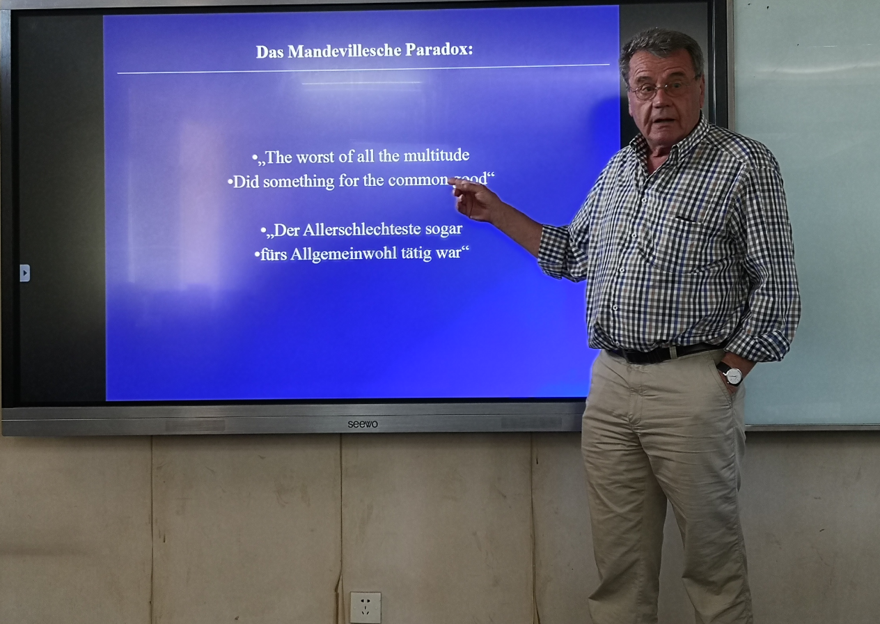 2019年10月21日,德国杜塞尔多夫大学教授、语言学家鲁尔道夫·凯勒(Rudi·Keller)先生来到我院,于上午10点和下午14点30分,为我院德语专业全体同学带来了题为“关于语言的变迁”和“德语有衰败的危险吗”两场德语语言学专题的学术讲座。