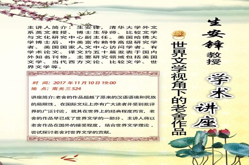 2017年11月10日晚7点,应厦门大学外文学院邀请,清华大学外文系英文教授、博士生导师、比较文学与文化研究中心副主任生安锋教授莅临我院,以《世界文学视角下的老舍作品》为题,举办了一场别开生面的学术讲座。生安锋教授系美国哈佛大学博士后,并入选2010年度教育部市级优秀人才支持计划、2012年度“北京市中青年社科理论人才‘百人工程’计划”。此次讲座由外文学院院长张龙海教授主持。