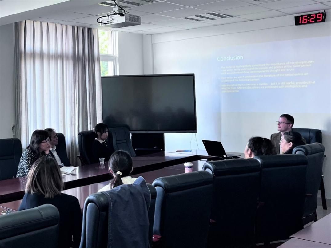 最后,McGovern博士提出,历史研究应基于文本研究,而文学研究也不应脱离历史语境。他认为研究者仍能在此类学科交叉研究中获得丰富启示,即使历史与文学的交叉研究已经成为老生常谈。在互动环节中,参会师生就文学及历史研究的相关问题与McGovern博士展开讨论,从教学科研的多个角度进一步探讨了都铎王朝的丰富历史与文化,McGovern博士还基于个人经历,为在场的英语文学方向研究生提出了建议与期待。