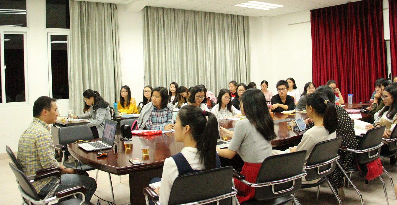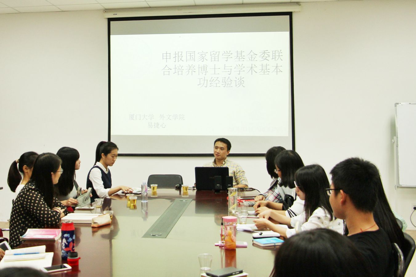 11月16日晚7时,外文学院“博采南光”博士沙龙第三期在南光三319举行。本次活动邀请了外文学院2014级博士生易捷心担任主讲人。易捷心现就读于我院英语语言文学专业,研究方向为美国文学与文化,厦门大学2015年国家公派高水平项目联合培养博士生,曾于2015.9—2016.9至美国南卡罗来纳大学访学。本次沙龙,他以“留学经验谈—学术基本功的养成”为主题,从确定研究计划、主动联系导师以及学习经验等方面分享了自己的学术科研心得。外文学院40名硕博研究生参加了此次沙龙。