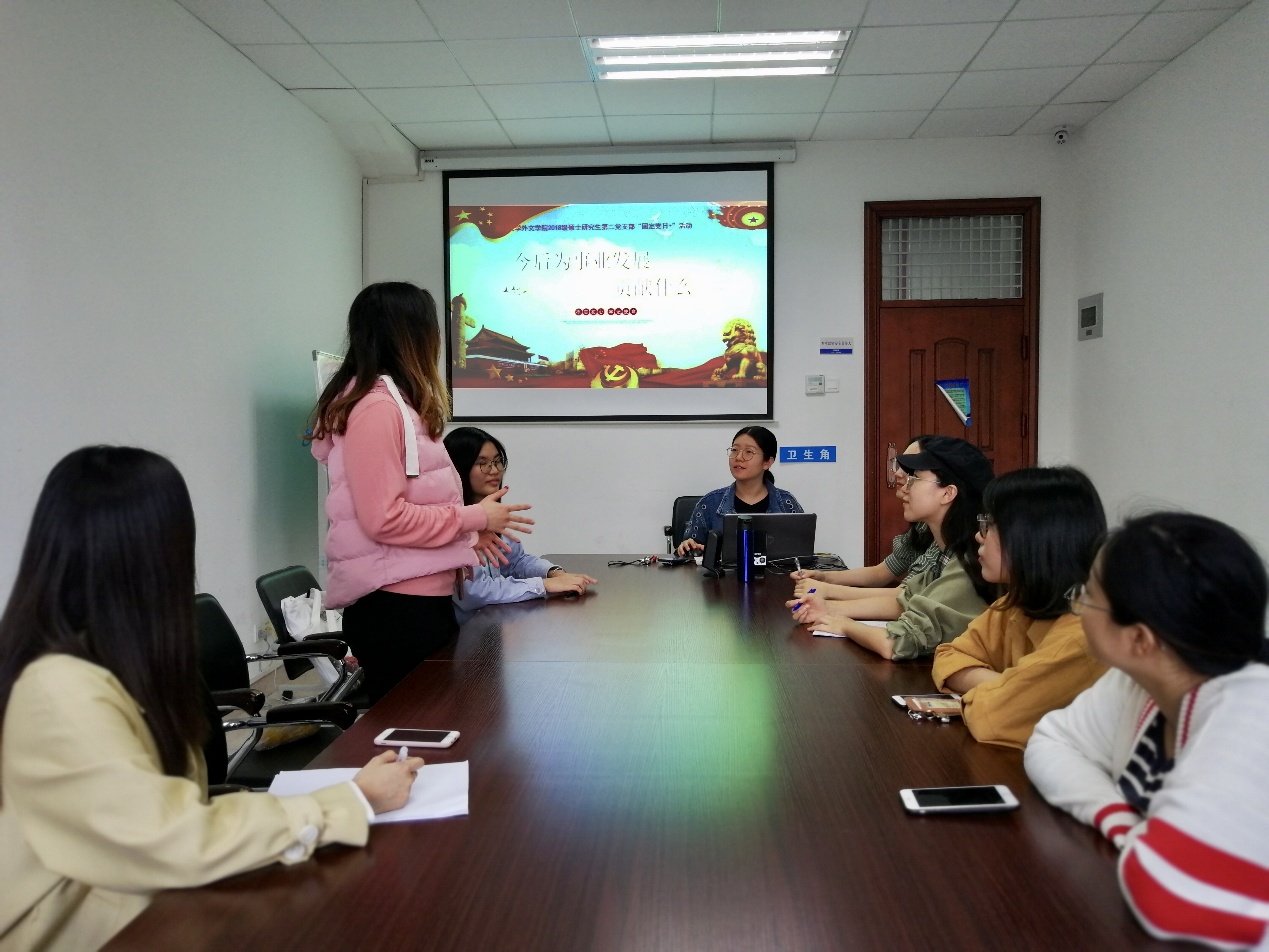 为深入推进“不忘初心、牢记使命”主题教育,进一步坚定理想信念,外文学院2018级硕士研究生第二党支部于11月7日中午在德贞楼209召开了“今后为事业发展贡献什么”主题“固定党日+”活动。