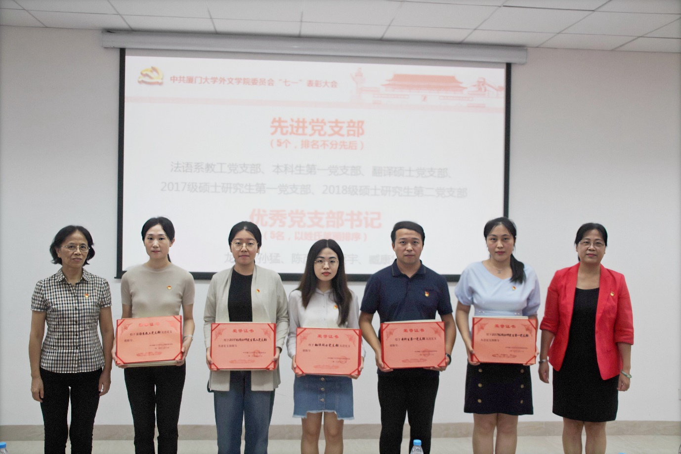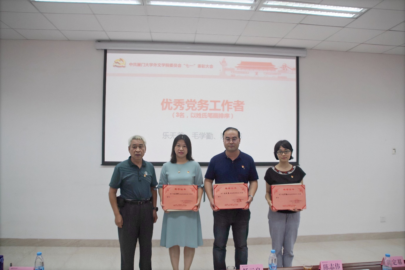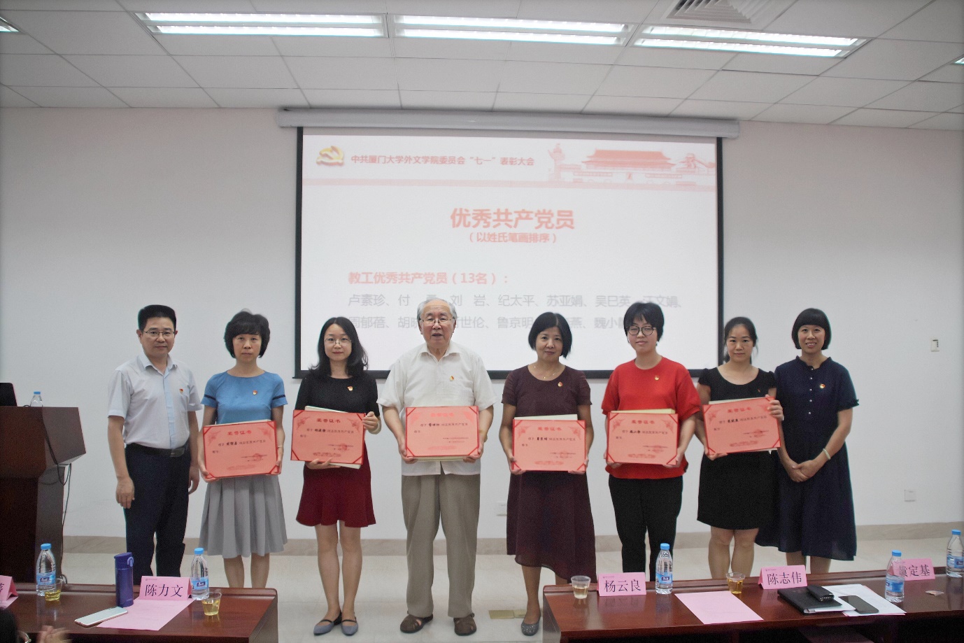 7月10日下午,为庆祝中国共产党成立98周年,同时表彰先进、鼓舞干劲,激励和引导广大党员学习先进典型、牢记党员使命,中共厦门大学外文学院委员会“七一”表彰大会在南光三112报告厅隆重举行。厦门大学关工委主任陈力文,外文学院党委书记陈志伟,院长陈菁,党委副书记杨云良、沈丽秀,党委委员、副院长徐琪、辛志英,党委委员顾鸿飞、戴鸿斌、乐无恙,学院关工委常务副主任纪太平出席了本次大会。学院党委陈志伟书记在会上发表讲话。大会由杨云良副书记主持。