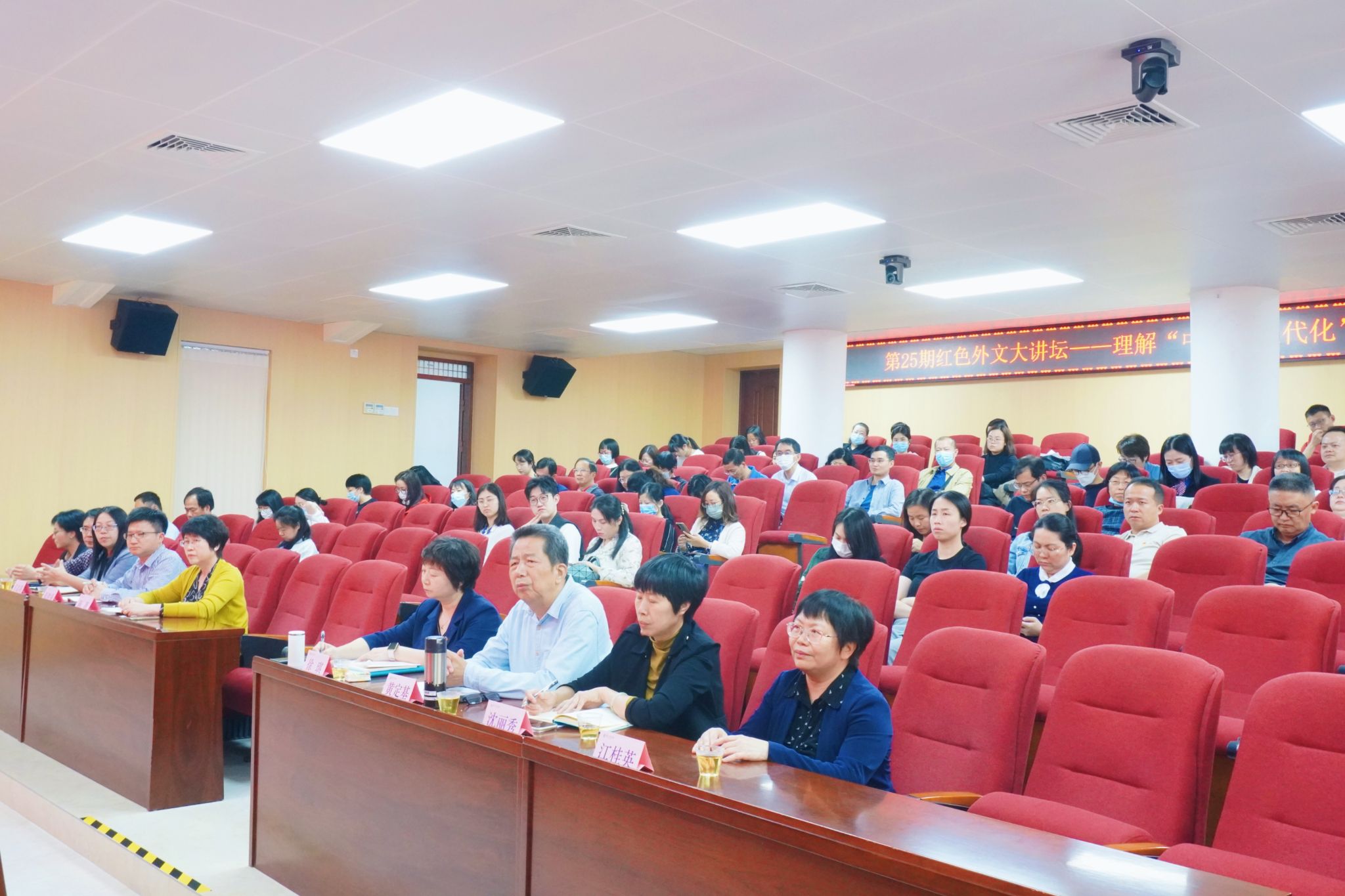 为扎实推进学习贯彻习近平新时代中国特色社会主义思想主题教育工作,深入学习贯彻党的二十大精神,4月26日下午,外文学院党委邀请校党委宣传部/教师工作部部长、社科处处长高和荣教授莅临“红色外文大讲坛”作题为《理解“中国式现代化”》专题报告,启动学院主题教育第一次理论学习中心组专题学习。校基层党建工作联络员黄定基,学院党政班子成员,院党委理论学习中心组成员,师生党支部书记和全院教职工参加报告会。报告会由外文学院党委书记徐琪主持。