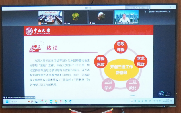 许德金教授详细介绍了中山大学构建外语专业“三进”工作新格局的好做法好经验。做好顶层设计,强化政治引领,勇于探索、开拓创新,在中山大学率先试点推进课程思政建设;依托广东省高校课程思政教研示范中心——中山大学外语课程思政研究中心,不断加强师资培训;以“三进”教材、“三进”学术、课程思政、思政课程、学术思政为抓手,构建“五位一体”的“三进”工作育人新体系;坚持全面推进,实现“三全育人”,以第一课堂为抓手,推进《习近平谈治国理政》多语种版本进课堂,以第二课堂为补充,将课程思政融入学术研究、学科竞赛和社会实践。