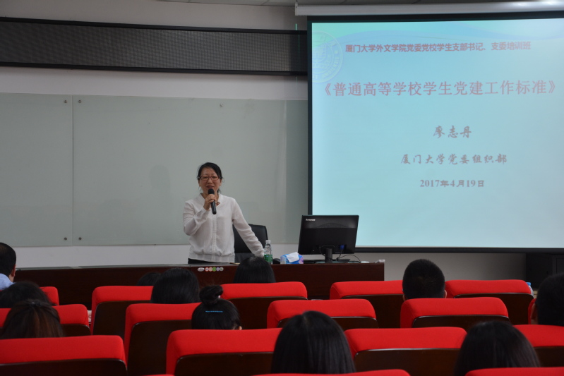 4月19日中午12:45,外文学院党委党校在南光三313报告厅举行学生党支部骨干培训。培训聚焦学生党支部工作热点难点问题,邀请到校党委组织部副部长廖志丹解读《普通高等学校学生党建工作标准》文件精神。学院党委副书记郑新风、杨云良,团委书记乐无恙、副书记肖盈、党务秘书张彬与学工部全体成员、各学生党支部书记、支委50人出席了培训会。会议由郑新风副书记主持。