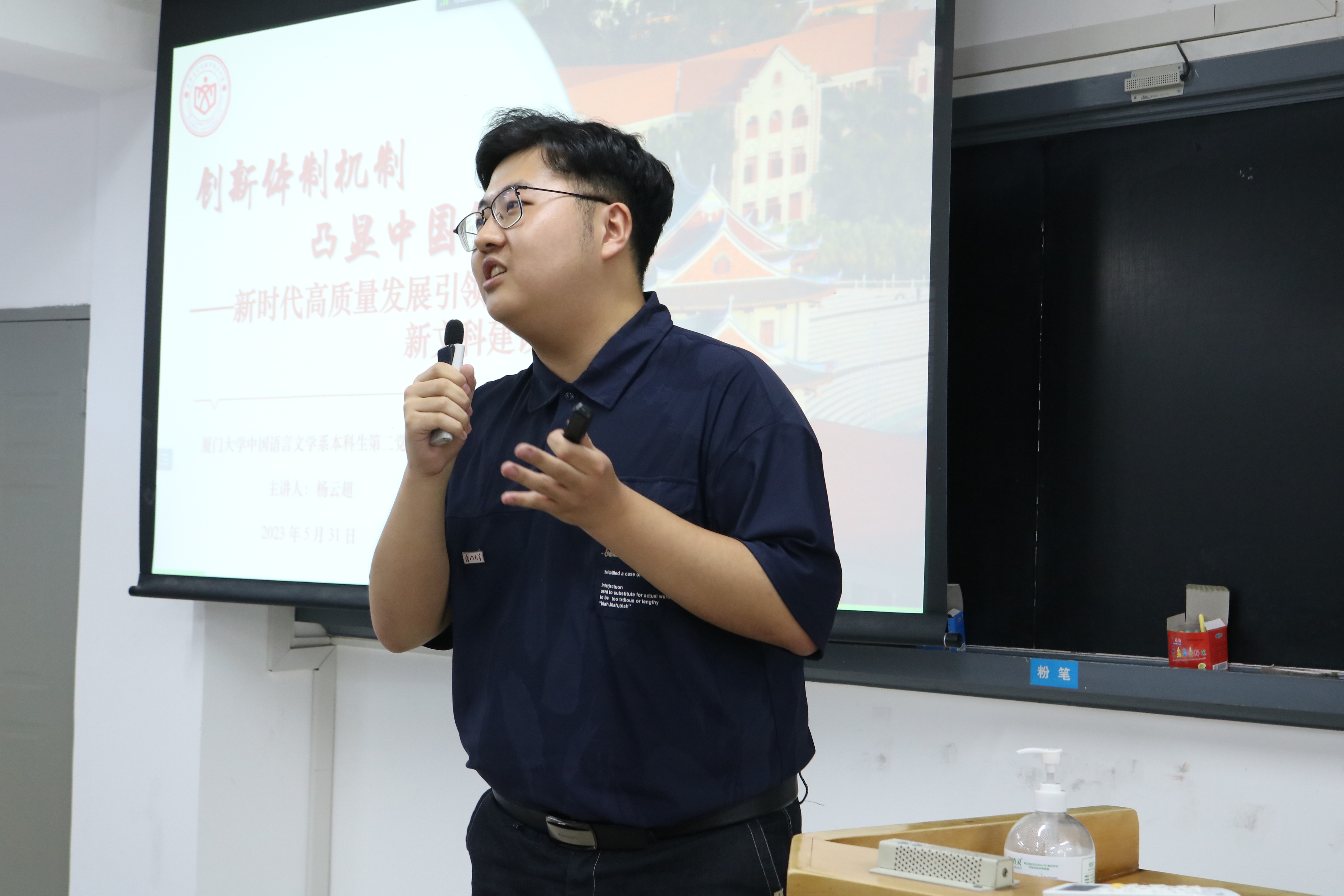中国语言文学系本科生第二党支部杨云超同学以“创新体制机制,凸显中国气派”为题,介绍了新时代高质量发展引领下的新文科建设情况,同时提出,广大学子应立足服务国家需求、扎根伟大实践,立志成为拔尖紧缺人才。外文学院本科生第四党支部罗靖、贾雨晨同学围绕“科教兴国、人才强国”联合讲授微党课。罗靖同学首先介绍了党的十八大以来关于教育、科技、人才工作的重要论述,在此基础上,贾雨晨同学以上海外国语学社的诞生、《英汉大词典》与《新英汉词典》主编陆谷孙老师和北京冬奥会外语志愿者的事迹为例,论述了外文学科与外文学子的时代使命。材料学院本科生党支部李龙琪同学以“满腔热血意,一颗中国心”为题,阐述了材料学科对当今中国科技与经济发展的重要推动作用。他表示,面对复杂的国际形势与国外的技术封锁,材料领域的青年学生应努力专精自身专业技能,努力成为符合时代号召和社会需要的创新型人才。