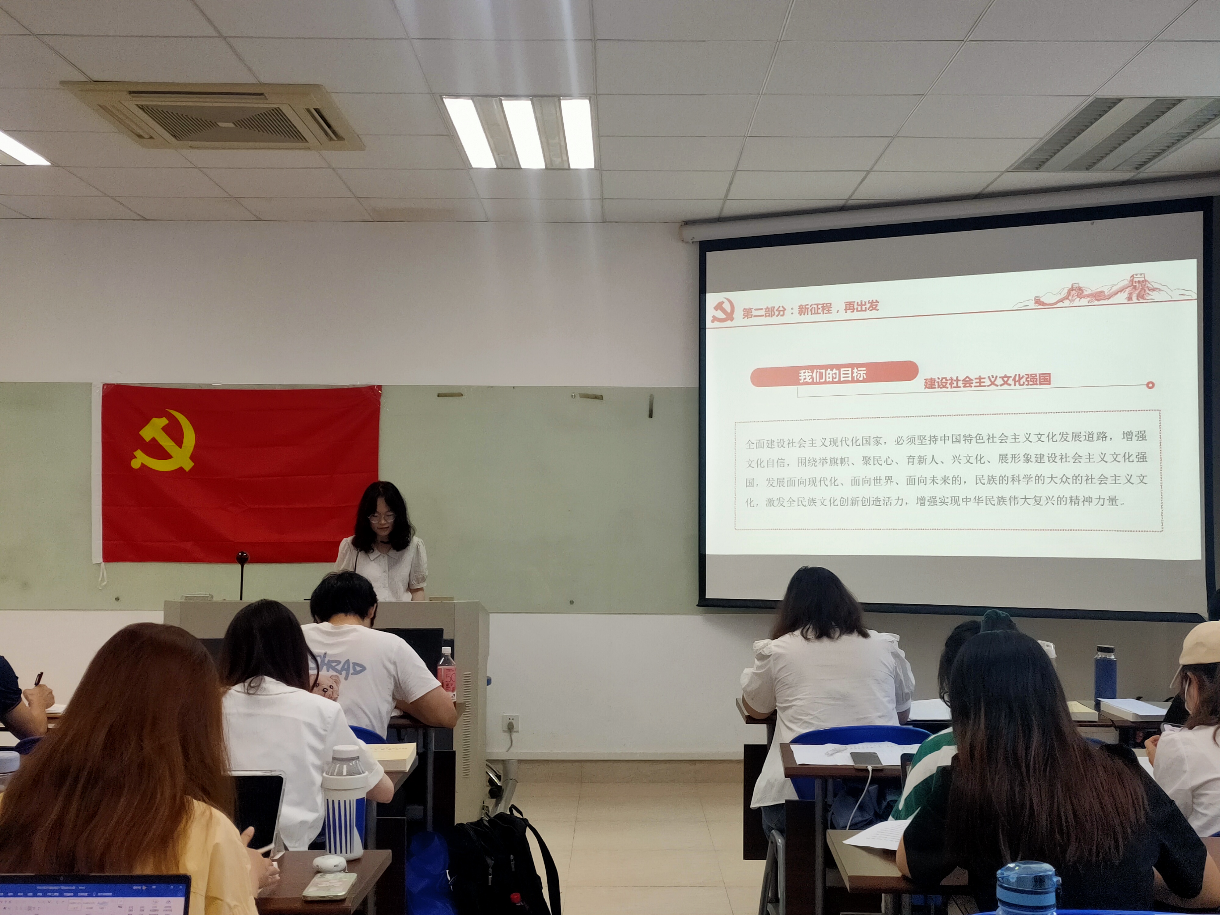 随后,外文学院本科生第二党支部副书记刘美伦领学《习近平谈治国理政》第四卷有关文化自信的论述。她谈到,我们应当不忘本来、吸收外来、面向未来,创作、传播优秀的、具有中国特色的作品,坚定文化自信。新闻传播学院李佳雯同志领学党的二十大报告第八章《推进文化自信自强,铸就社会主义文化新辉煌》。她表示,作为新时代青年,我们应自觉传承、发扬中国文化,繁荣发展社会主义文化,增强中华文明的传播力,以提高其在世界范围内的影响力。
