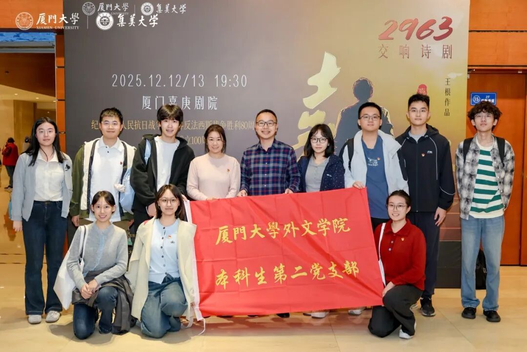 今年是中国人民抗日战争暨世界反法西斯战争胜利80周年,回望峥嵘岁月,无数先辈以热血铸就丰碑;追忆侨领风骨,校主陈嘉庚先生的报国初心始终熠熠生辉。为引导青年党员传承伟大抗战精神、厚植爱国爱校情怀,在党支部书记戴晓燕带领下,本科生第二党支部青年学生党员代表于12月13日前往厦门嘉庚剧院观看交响诗剧《嘉书·2963》,在艺术熏陶中感悟初心使命,在精神传承中汲取奋进力量。学院党委书记徐琪、党委副书记郑辉一同观看了《嘉书·2963》。