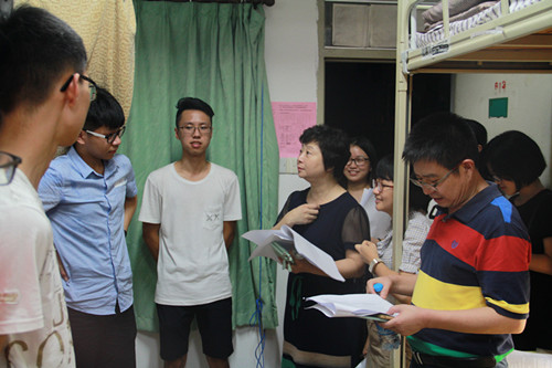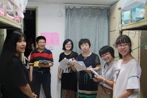 8月25日晚,在圆满完成外文学院208名本科新生的入学注册工作后,学院开展了走访新生宿舍、慰问新同学的活动。外文学院党委副书记杨云良老师,副院长徐琪老师,院团委副书记、2016级本科生辅导员肖盈老师和兼职辅导员廖舒老师代表学院走访了外文学院2016级本科新生宿舍,为新同学们送去慰问和关怀。外文学院本科生团总支书记王铭鑫、学生会主席谭晨、宣传中心主任肖宁双等多名学生干部随同而行。 有朋自远方来,不亦乐乎。学院对新同学们的入学、入住情况表示高度关注,领导老师们先后走访了凌云二、芙蓉九这两栋外文学院新生所在的宿舍楼。老师进门后,同学们用热烈的掌声欢迎老师们和学长学姐的到来。领导老师们请每位同学作了自我介绍,并亲切询问他们来自何处、是否习惯住校生活、对大学生活的想法等。老师们还询问了同学们的兴趣爱好,希望大家能够在开学后勇敢地展示自己的特长。同时,领导老师们也向大家再三强调了宿舍安全问题。老师们的和蔼笑容和平易近人的语气使交谈氛围十分轻松,其言谈中句句都流露着对同学们的关切。新生们也都大方地自我介绍,与老师热情地交流。 晚上10点半,本次走访外文学院2016级本科新生宿舍的任务圆满完成。领导老师和老生们日出迎新、日落走访,一路奔波、不辞劳苦,为外文注入的新血液而感到高兴。大家为年轻的同学们加油鼓劲,也对他们充满了信心与期待。相信新同学们一定能很快适应军训与大学生活,融入外文学院这个温暖的大家庭;也祝愿他们能在未来的大学生活快乐成长、成才,早日实现自己贴在“梦想墙”上的梦想。  杨云良副书记、徐琪副院长与辅导员肖盈副书记一同走访新生宿舍