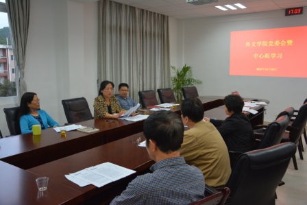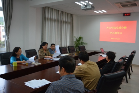 11月23日下午,外文学院党委在南光三524召开中心组专题学习,按照学校有关通知要求,认真学习党的十八届六中全会精神以及《关于新形势下党内政治生活的若干准则》和《中国共产党党内监督条例》,并就下一阶段学习宣传贯彻十八届六中全会精神工作进行了统一部署。会议由陈志伟书记主持。