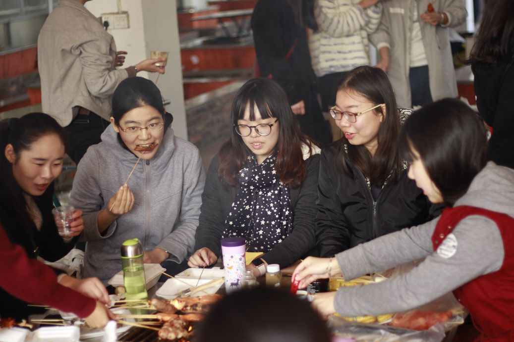一轮又一轮游戏飞快地进行着,不知不觉,吃午饭的时间到了,订购的食材也送到了桌前。同学们无心恋战,纷纷将目光投向了烧烤。“自己动手,丰衣足食”,很快,同学们点着炭火、架上烤架、刷好油料,食材放上烤架后很快就散发出诱人的香气。同学们互相分享、确保人人有份,吃着、聊着,满足味蕾的同时,也释放了课业压力,感受着来自集体的温暖。