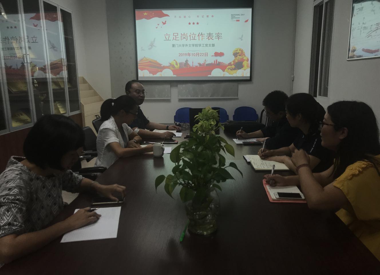 10月22日下午,外文学院学工支部全体党员在德贞楼401教室开展了“立足岗位做表率”主题“固定党日+”活动,本次学习活动由支部书记乐无恙同志主持。