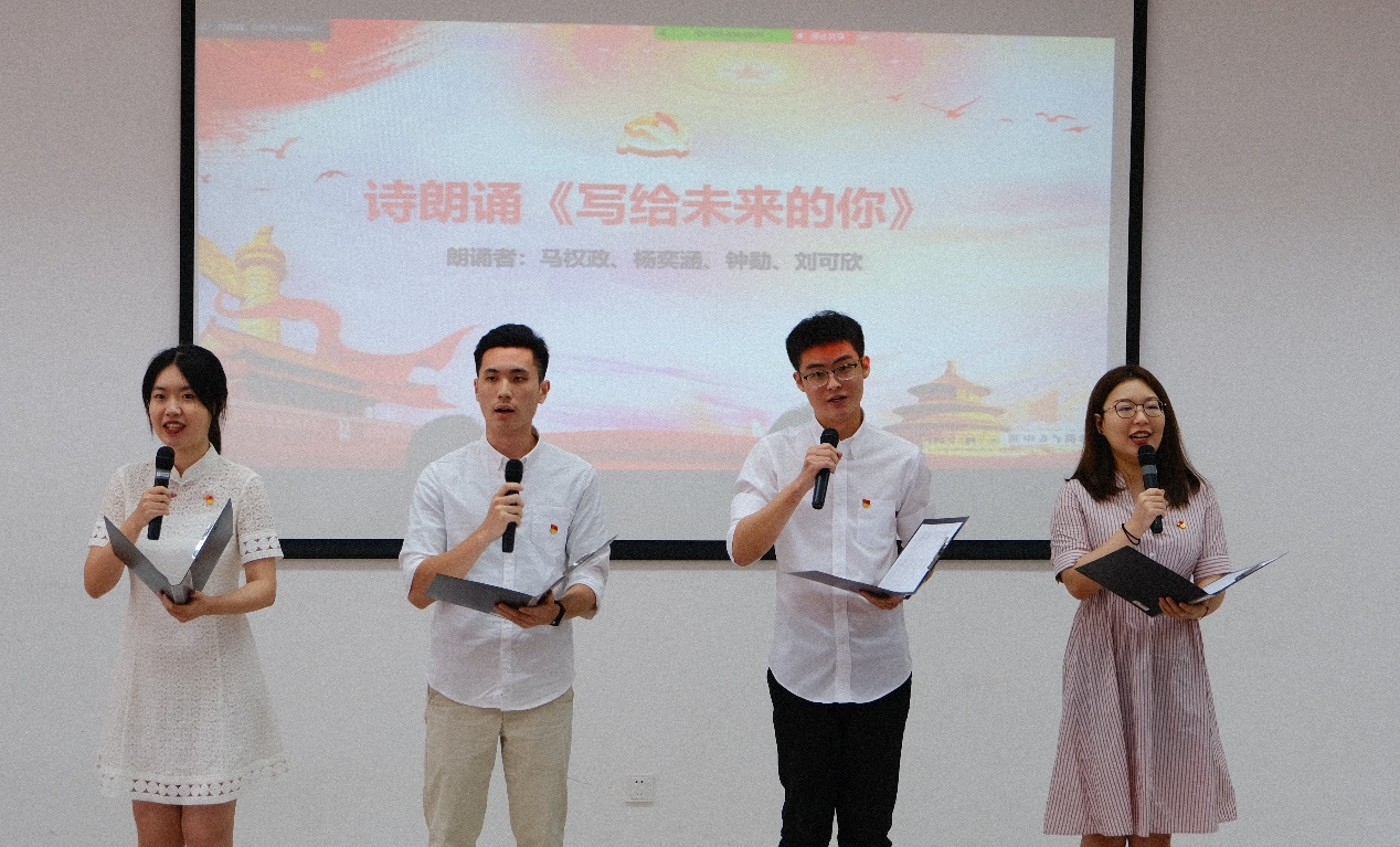 四位代表的分享让在座党员深受启迪、备受鼓舞,激励毕业生党员不忘初心,砥砺奋斗,青年追梦,笃定前行。接着,四位毕业生党员代表带来了诗朗诵《写给未来的你》,鼓励同学们以信仰点燃青春和生命,以梦想点亮今天和明天。与会师生党员还共同重温了入党誓词,铭记入党初心,进一步坚定理想信念。