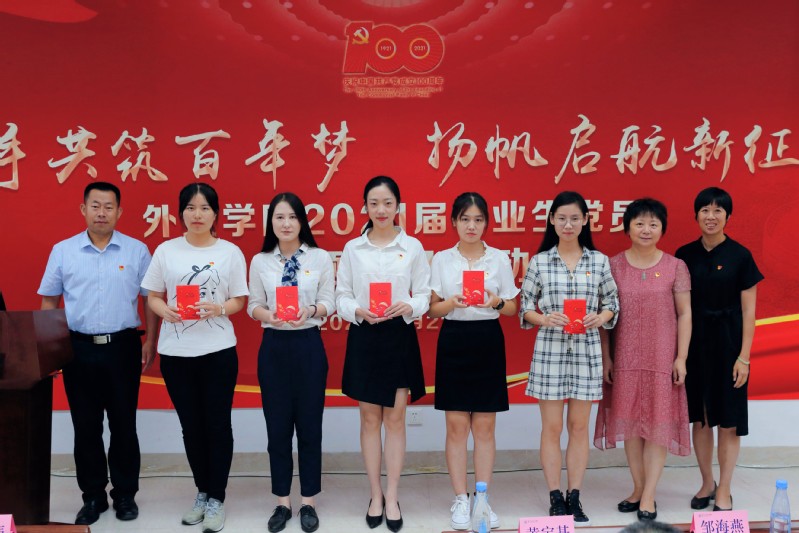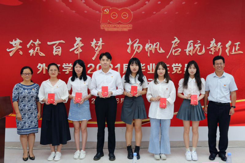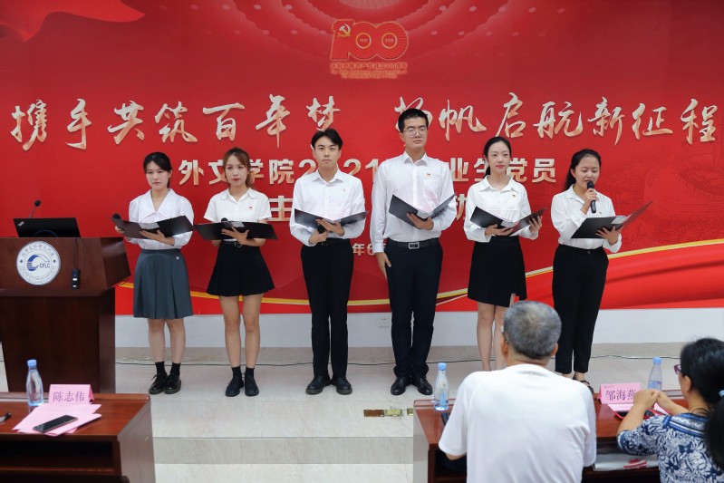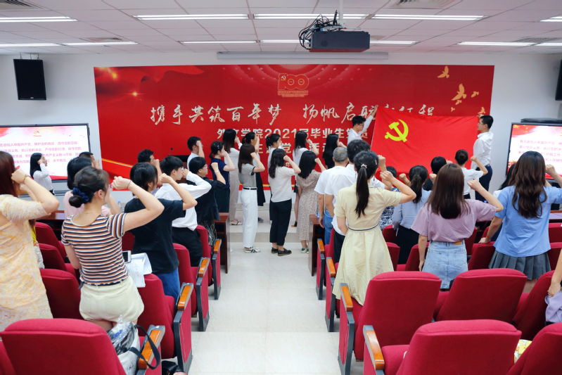 活动在慷慨激昂的国歌声中拉开帷幕。今年恰逢建党100周年,六位毕业生党员代表首先带来诗朗诵——《我爱你——中国共产党》,充分表达了对党的无限热爱和深情告白。同时,他们也用六种语言为中国共产党成立一百周年献上了最诚挚的祝福。